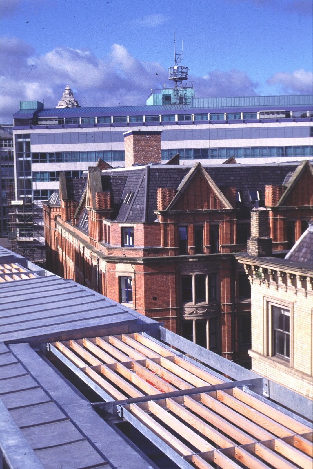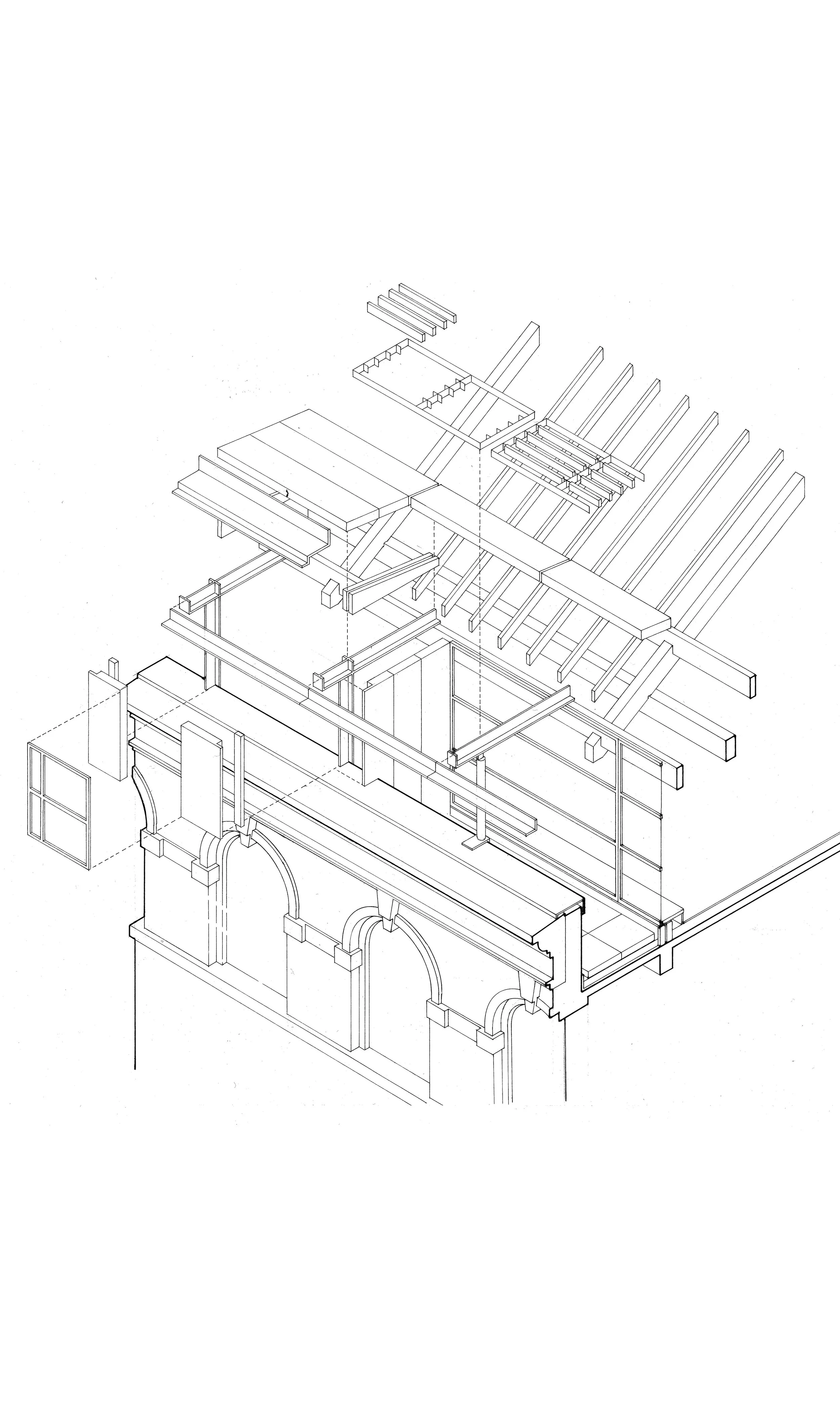 To optimise the use of the entire fourth-floor area required altering the existing eaves/cornice relationship to enable sufficient height to be provided at the extremities of the plan. The resolution of this in both practical and architectural terms came from the analogy with an attic dormer, often found in similar buildings, but ‘extruded’ around the perimeter. The solution emerged as a natural metal-covered perimeter beneath which the existing roof timbers remained, enabling the themes developed on the lower floors to be implemented.