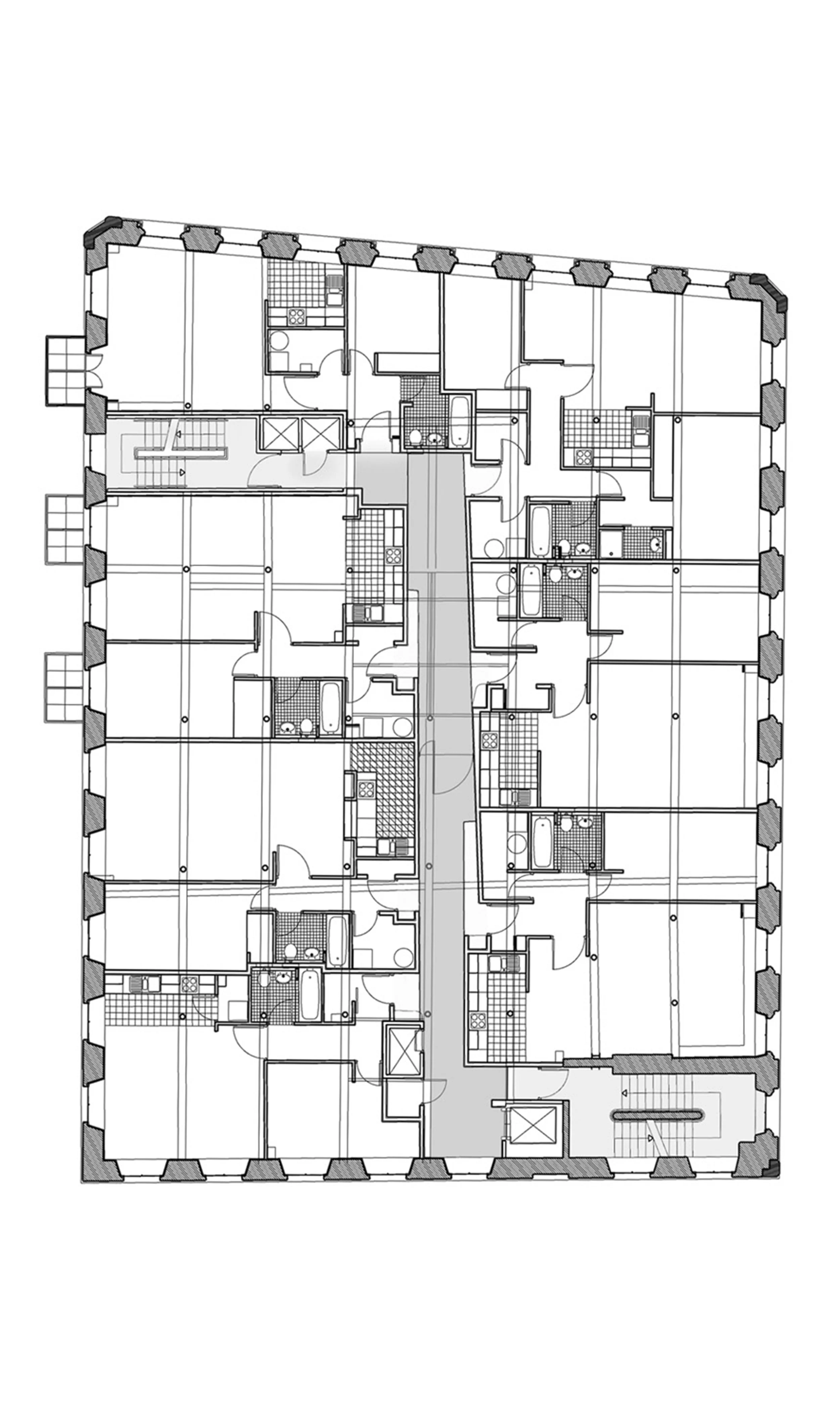 A plan form emerged based on the demand for smaller apartments on the lower floors and larger ones on the upper levels. The first floor, which sits over the licensed retail space consists of ten ‘pied à terre’ flats, the second and third floors consist primarily of one bedroom apartments and the fourth floor, primarily two bedroom apartments.