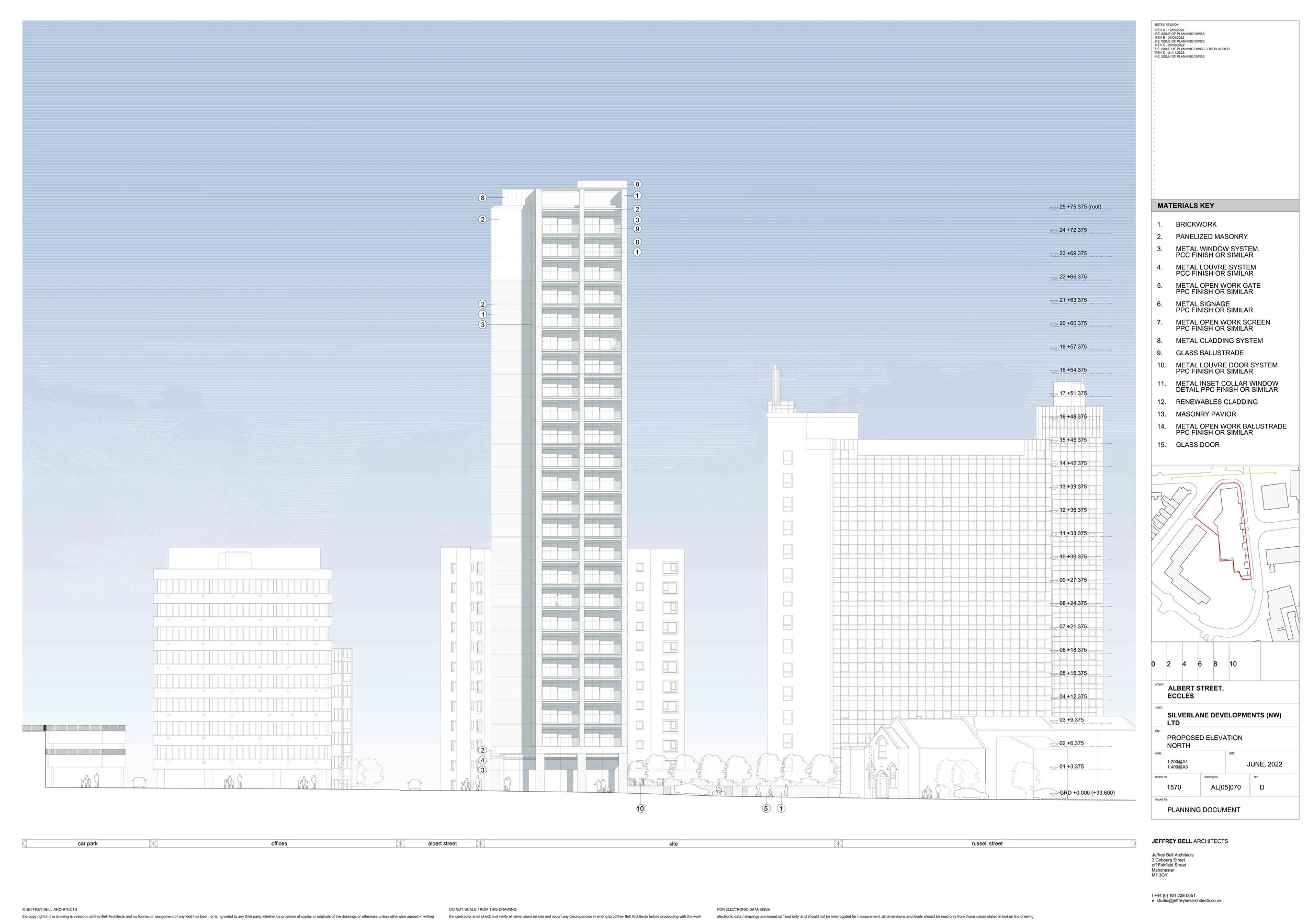 The accommodation takes the form of a ground plus seven-storey podium and a tower of ground plus 24 residential storeys. The tower element is sighted at the northern end of the site. The overall building mass runs parallel to Albert Street. The podium contains residential entrance spaces, townhouses, plant, car parking, refuse and bike stores and residential accommodation. The podium roof contains residential amenity space. The tower element contains a residential space bookended by a balcony residential space.