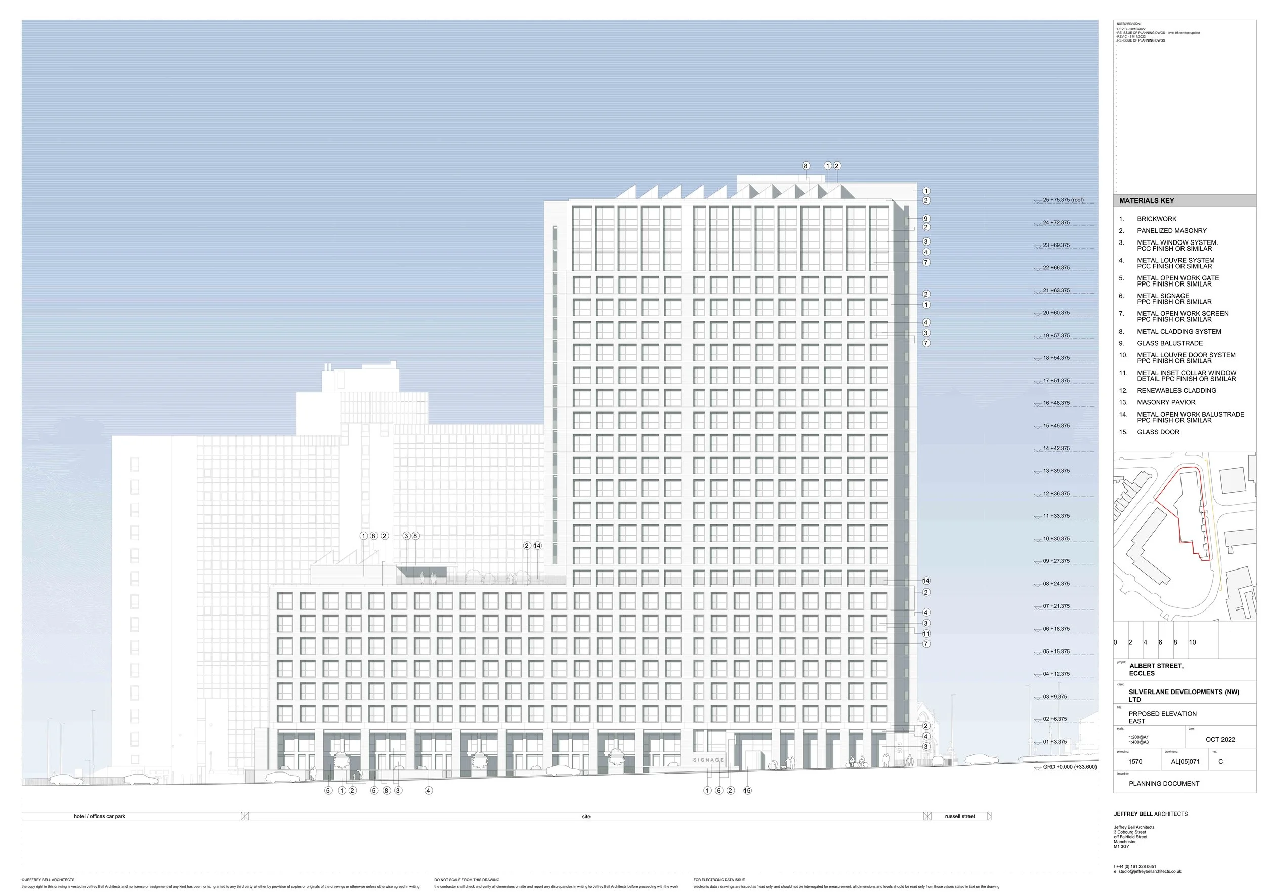 The building evolved as a simple stepped linear podium and tower form. A “street scale” linear volume, oriented north to south addresses Albert Street and forms the podium base with an enclosed courtyard oriented west addresses Peel Street. The tower element that sits on the podium establishes a clear typological relationship with the podium and the street.
