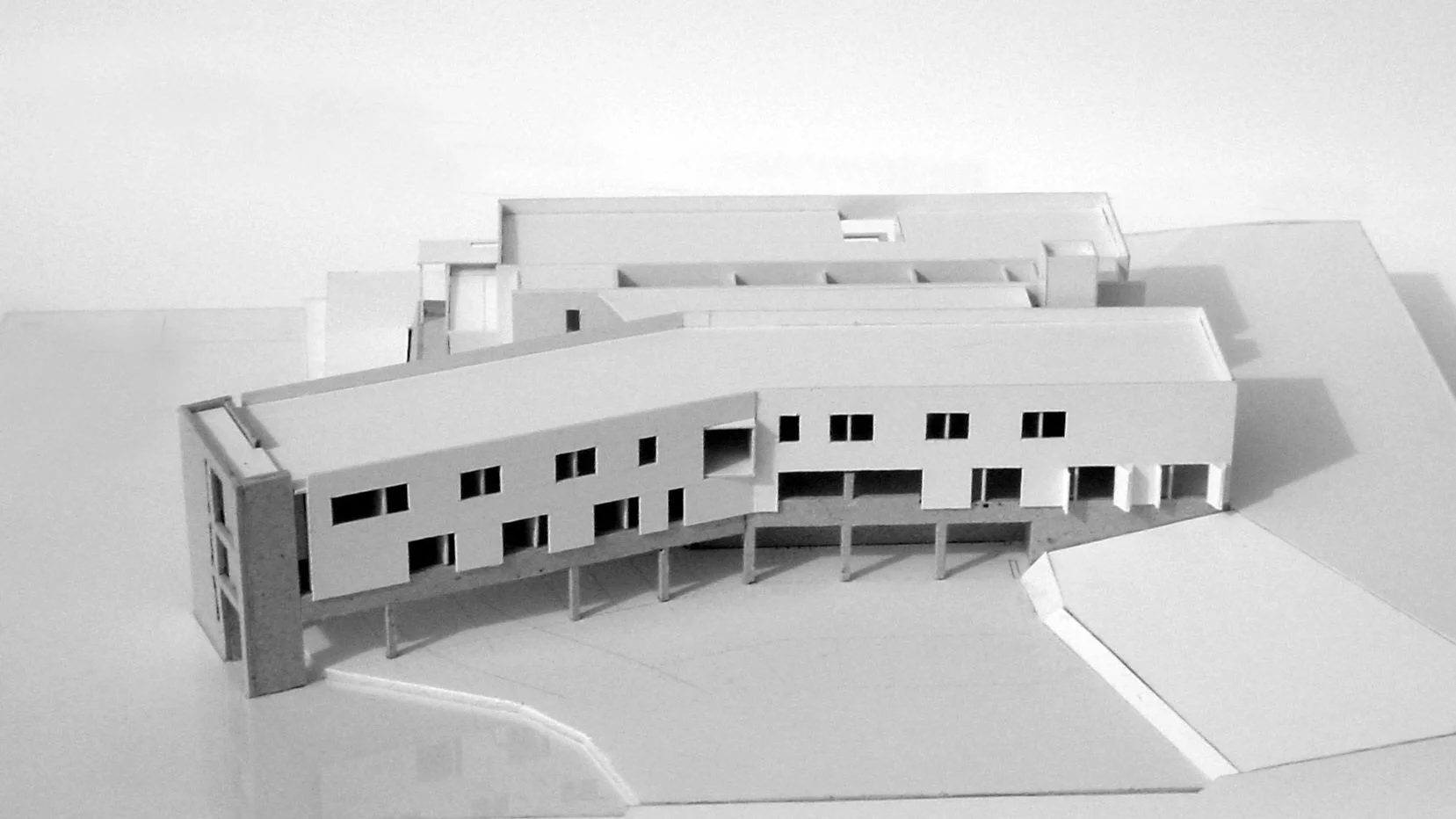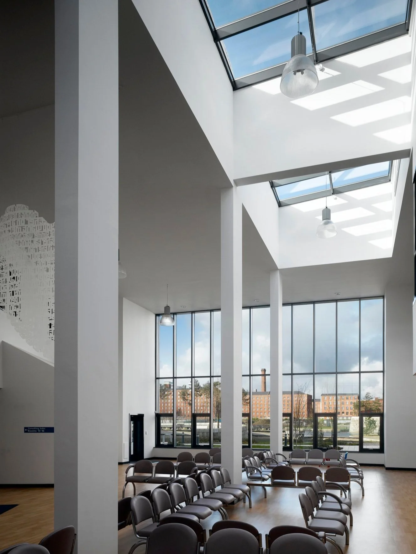 The proposed building is one of the catalysts for regeneration and whose elevation to Old Mill Street forms a new frontage together with the retail units in the adjacent plot over the new canal. The entrance to the health centre is set in this elevation. The upper accommodation line is cut back revealing a light well over the entrance, the revealed planes reflecting light and signifying the entrance. An articulated canopy also articulates the façade to the entrance and shopfront to the retail unit. The proposals essentially comprise of 2 buildings with an atrium space between them. The wings are deliberately set at irregular angles to maintain the freedom of expression of the other proposals in the Masterplan. Between the 2 wings of accommodation, the significant public area of the building with the reception and waiting areas is located, set at the centre of the building with a full-height glazed façade overlooking the new canal. To the upper floor is a gallery to the secondary support facilities in the health centre. At either end, the vertical circulation is logically located.