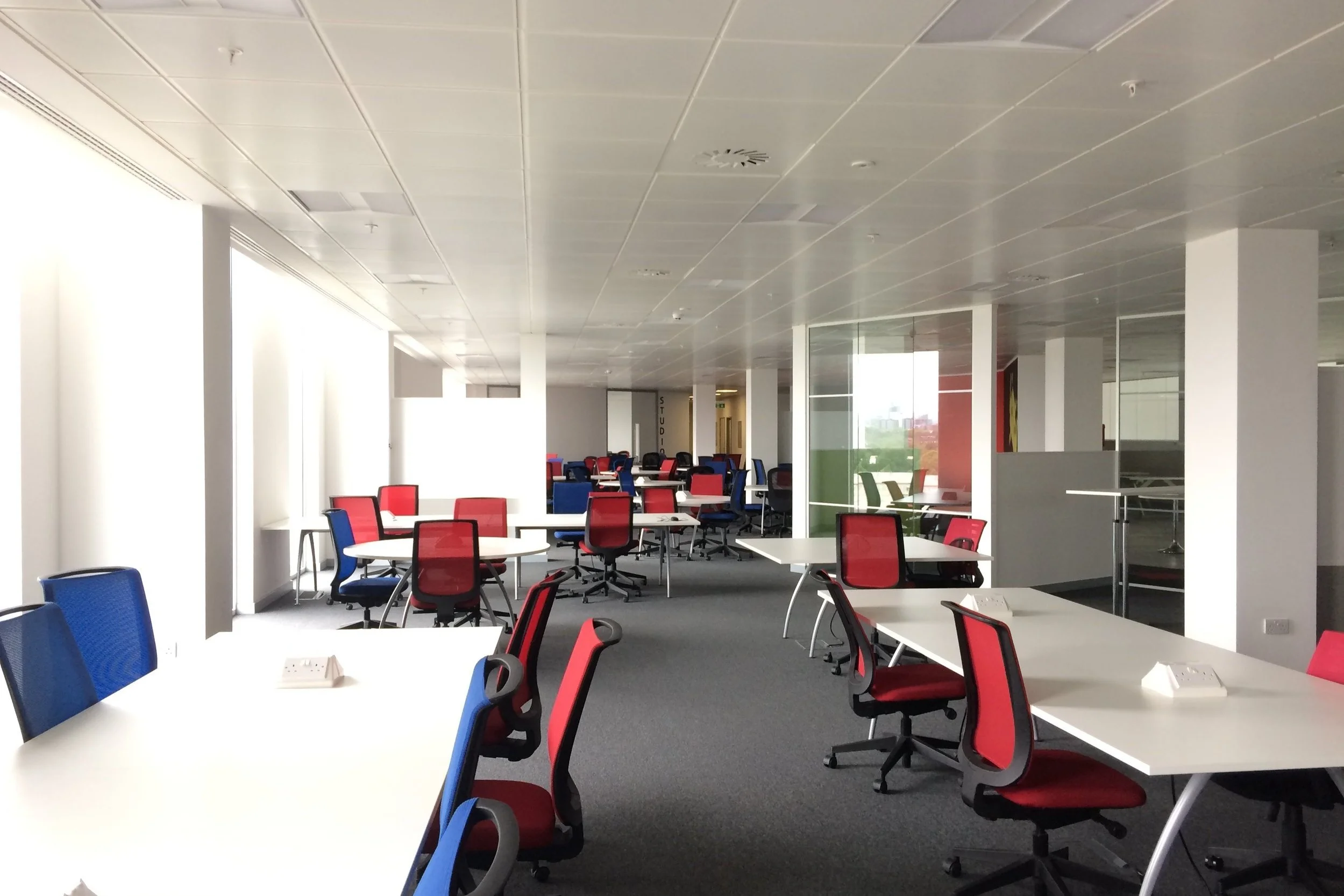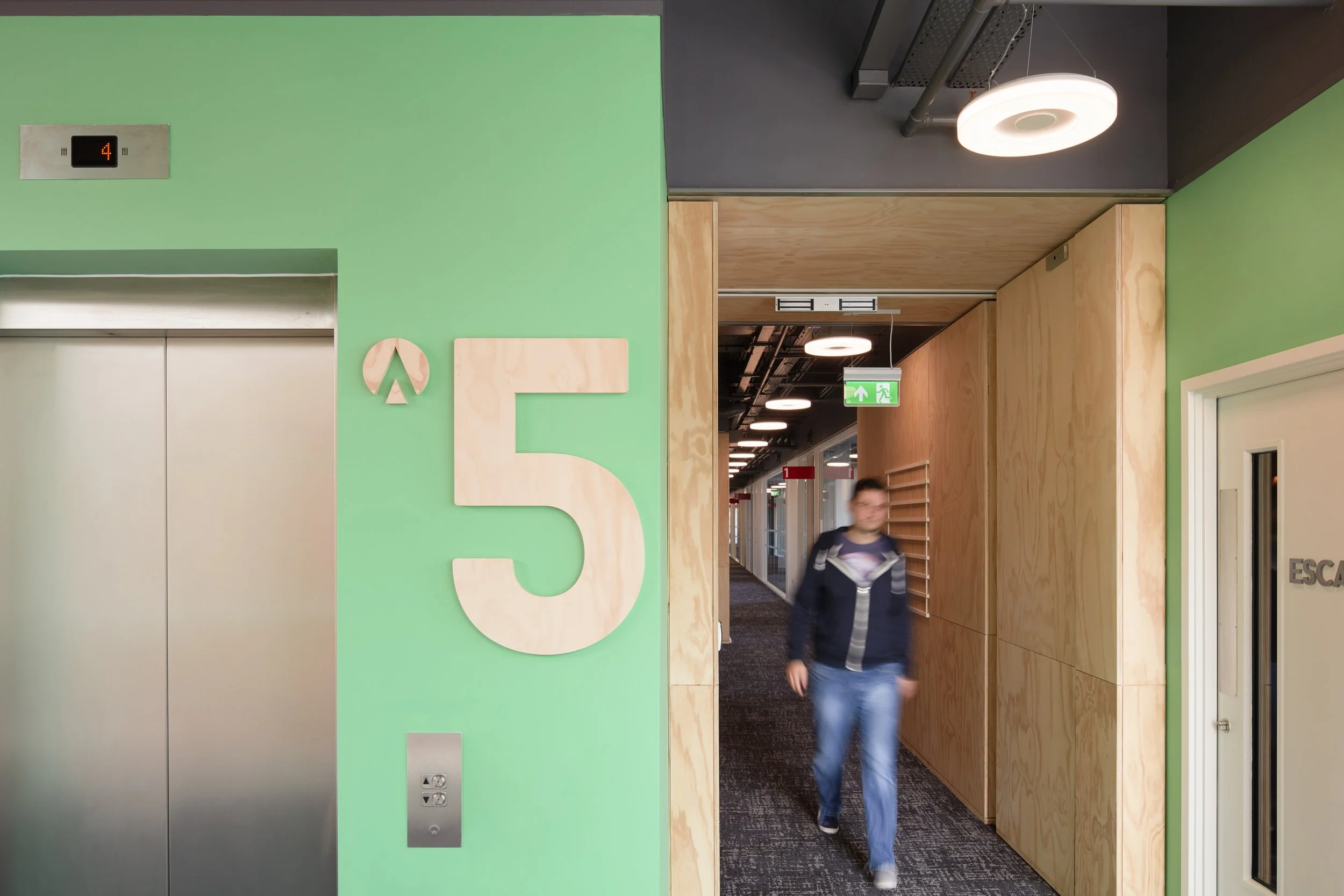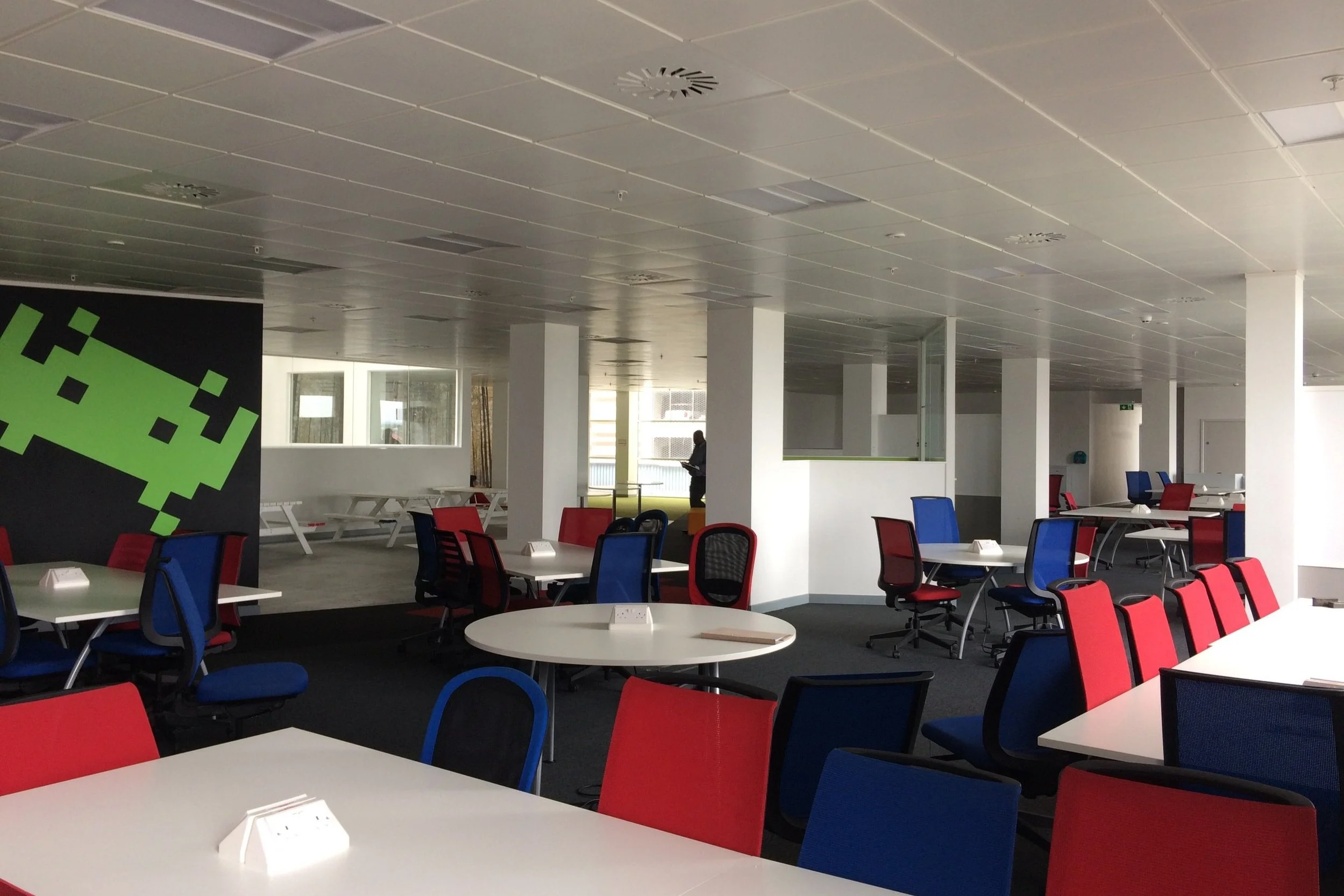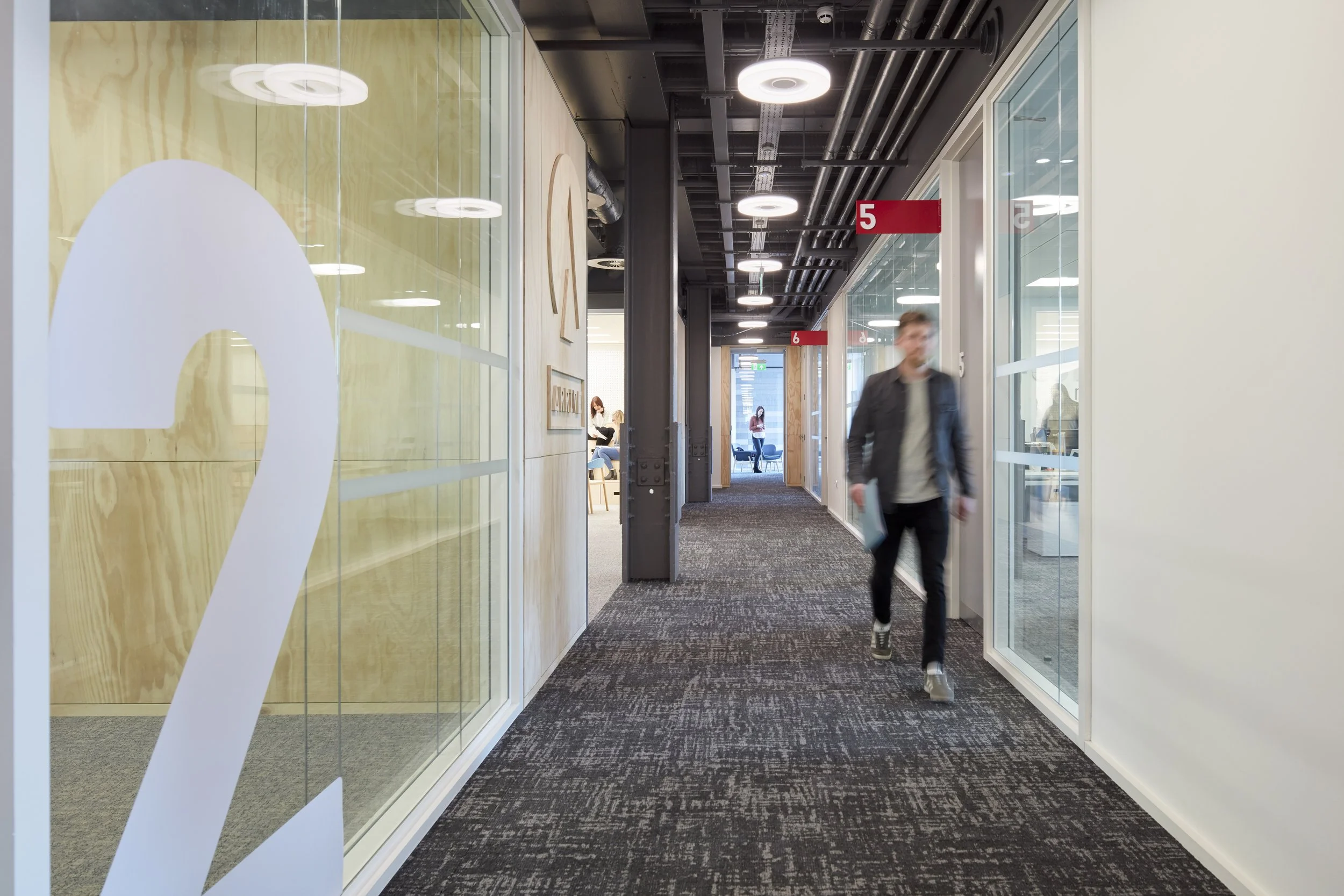 A legible plan form provides workspaces on either side of a spine corridor that are separated by tall glass walls with imposing full-height doors. Some workspaces look out across MediaCityUK; some look towards the full-height glazed atrium that houses an important suspended art installation, by emerging local artist James Roper. The installation titled: ‘Coalescence’, represents the values of the space; growth, interaction and collaboration while also bringing colour and animation within the feature atrium.
