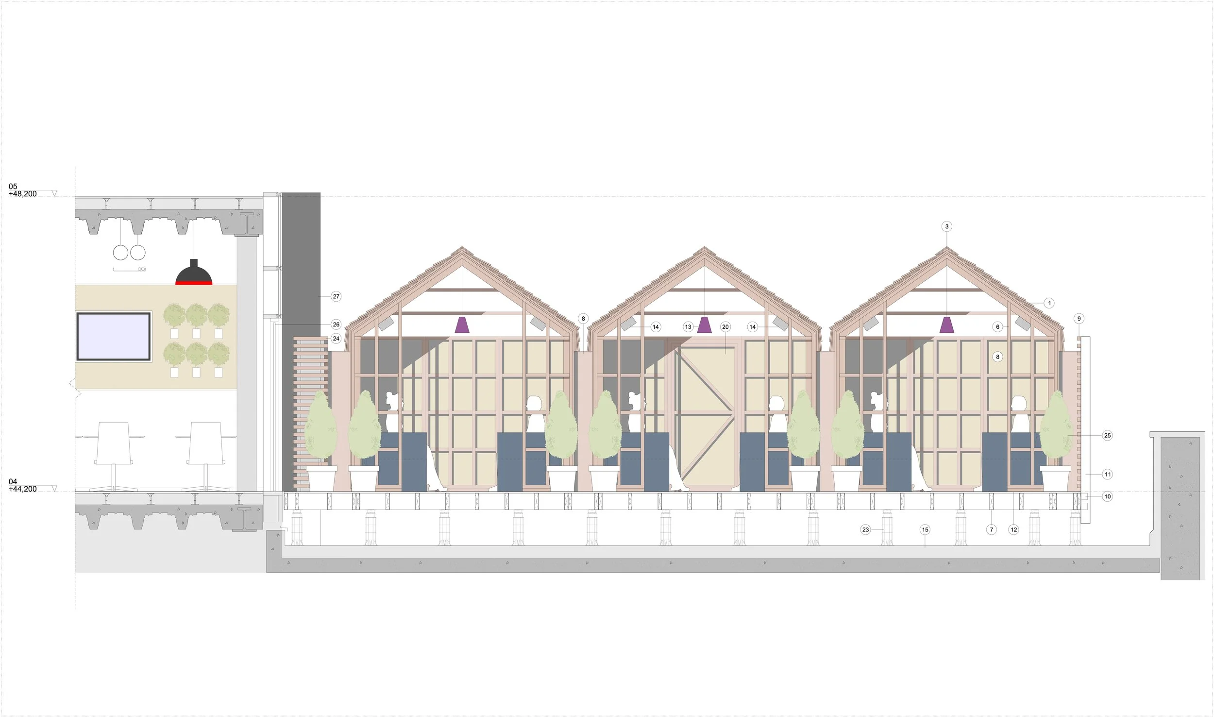 Much of the existing structure is left exposed and complemented with custom-made furnishings, including wooden desks and bright rugs, and lots of greenery; where possible previous fixtures and fittings have been reused.