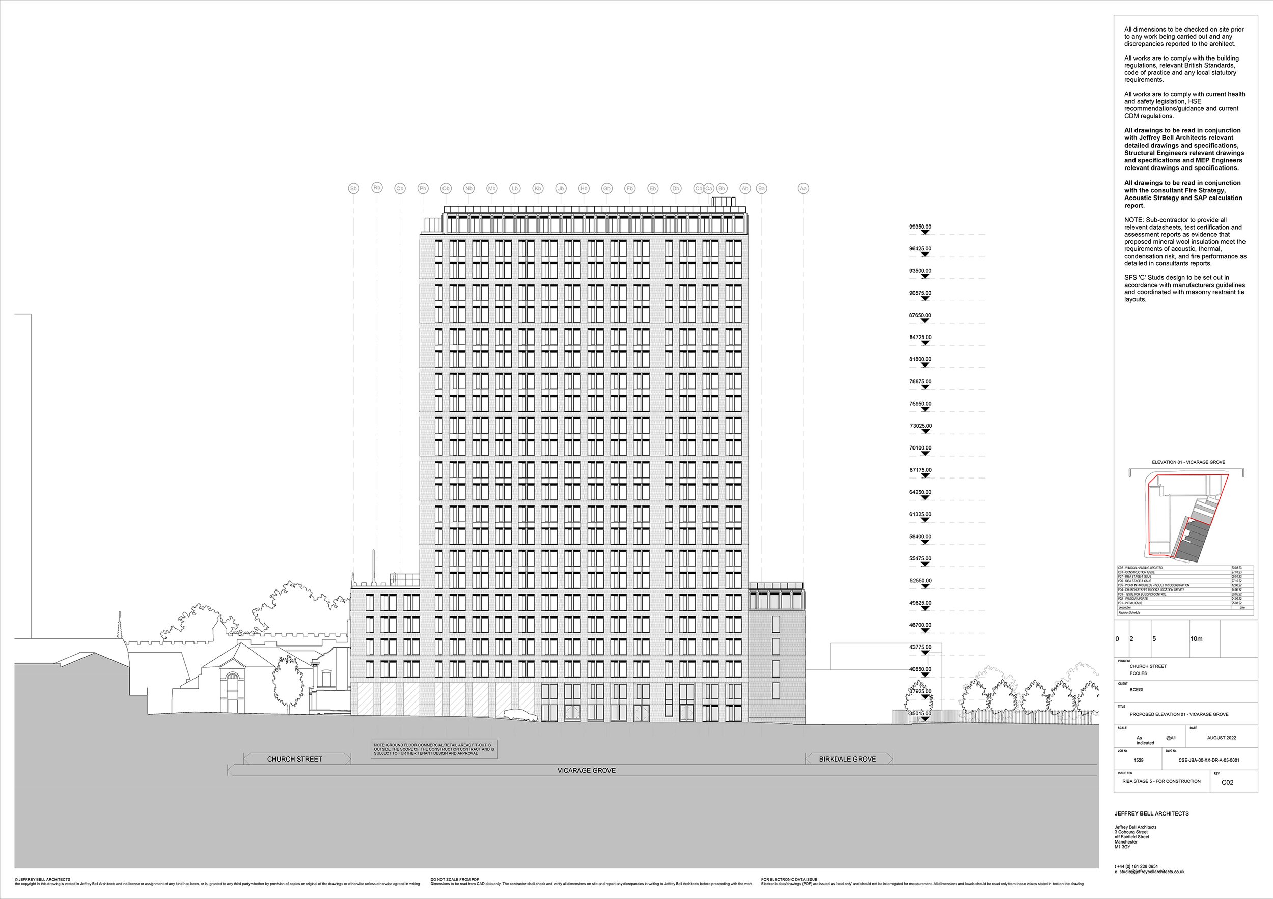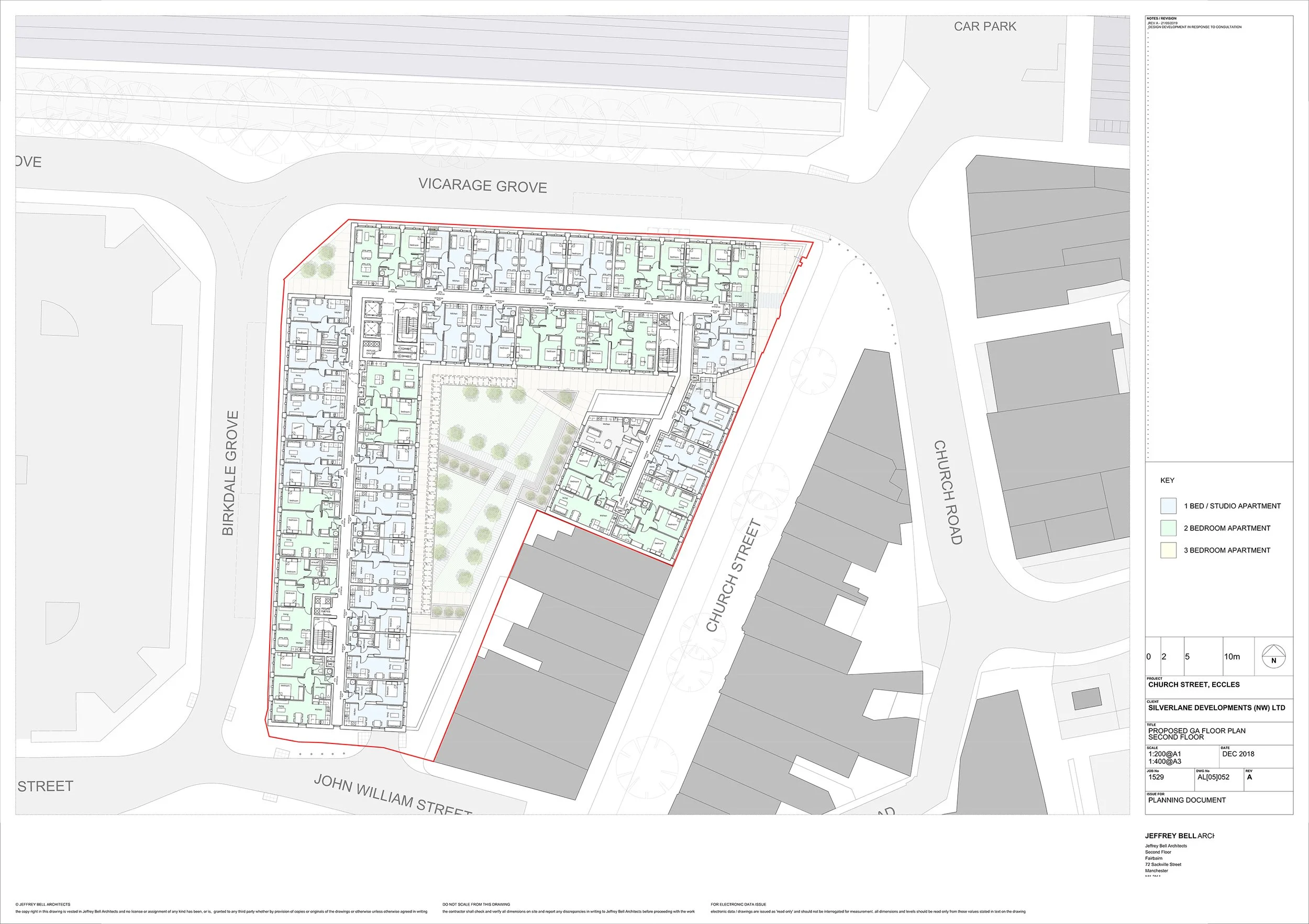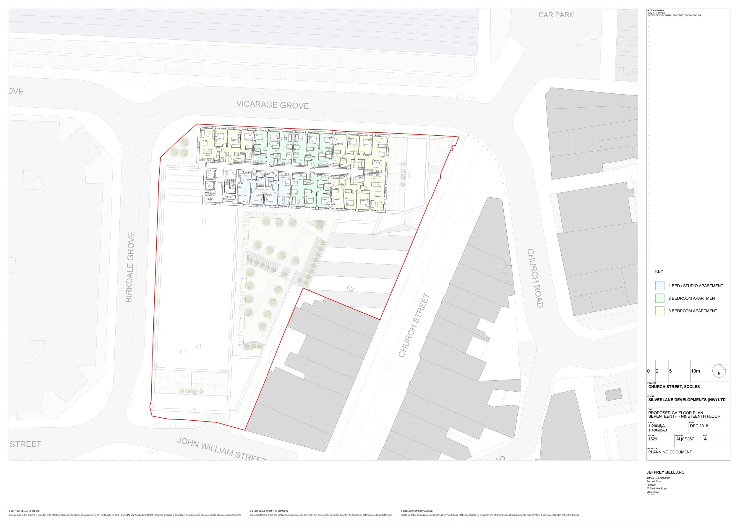 The accommodation takes the form of a ground plus 3 / 4 / 5 storey podium and a tower of ground plus 22 storeys. The podium is three-sided and addresses Church Street, Vicarage Grove and Birkdale Grove. One of the key challenges of the project is how to articulate a meaningful proposal that deals not only with the past and present of the area but also with the immediate future; a proposition that will completely transform the nature of Eccles. This new development will have to mediate between the existing context and issues that will be addressed by the emerging masterplan.