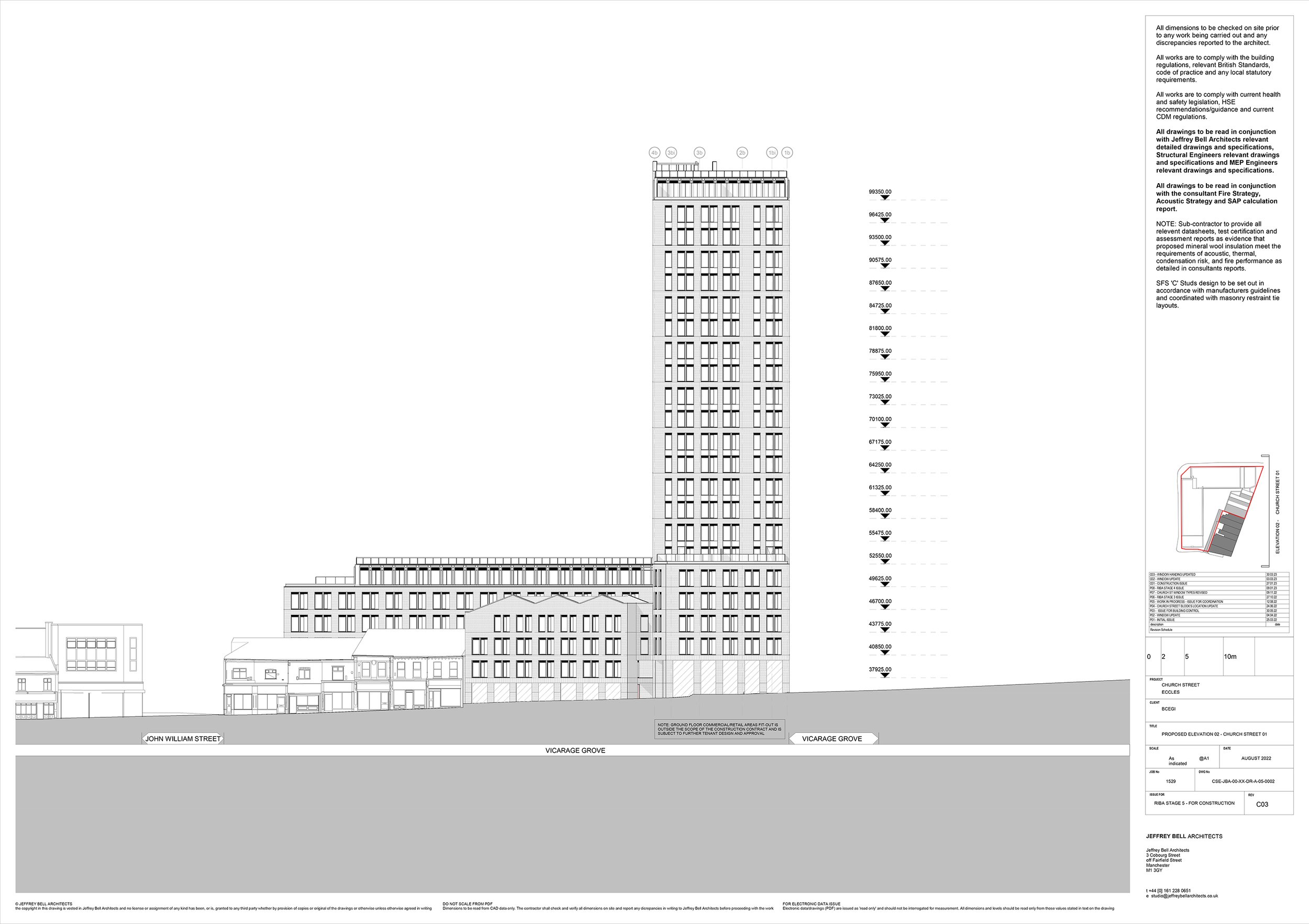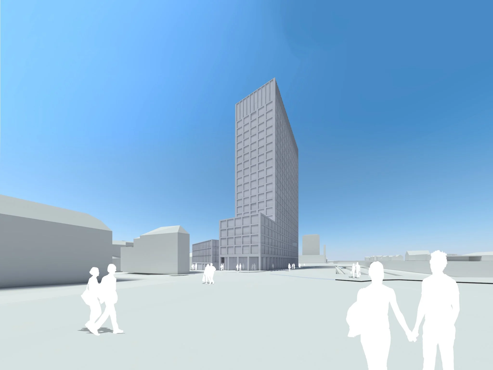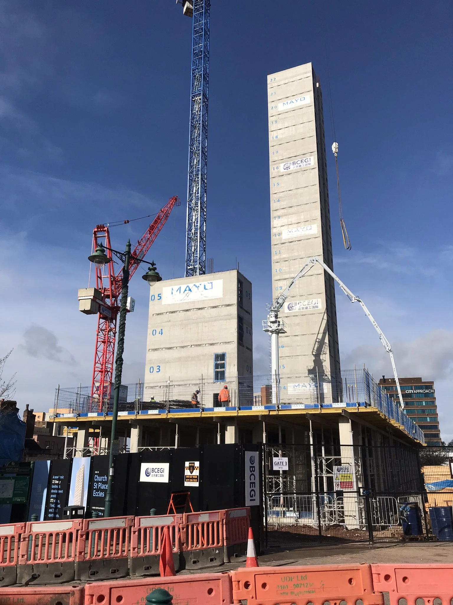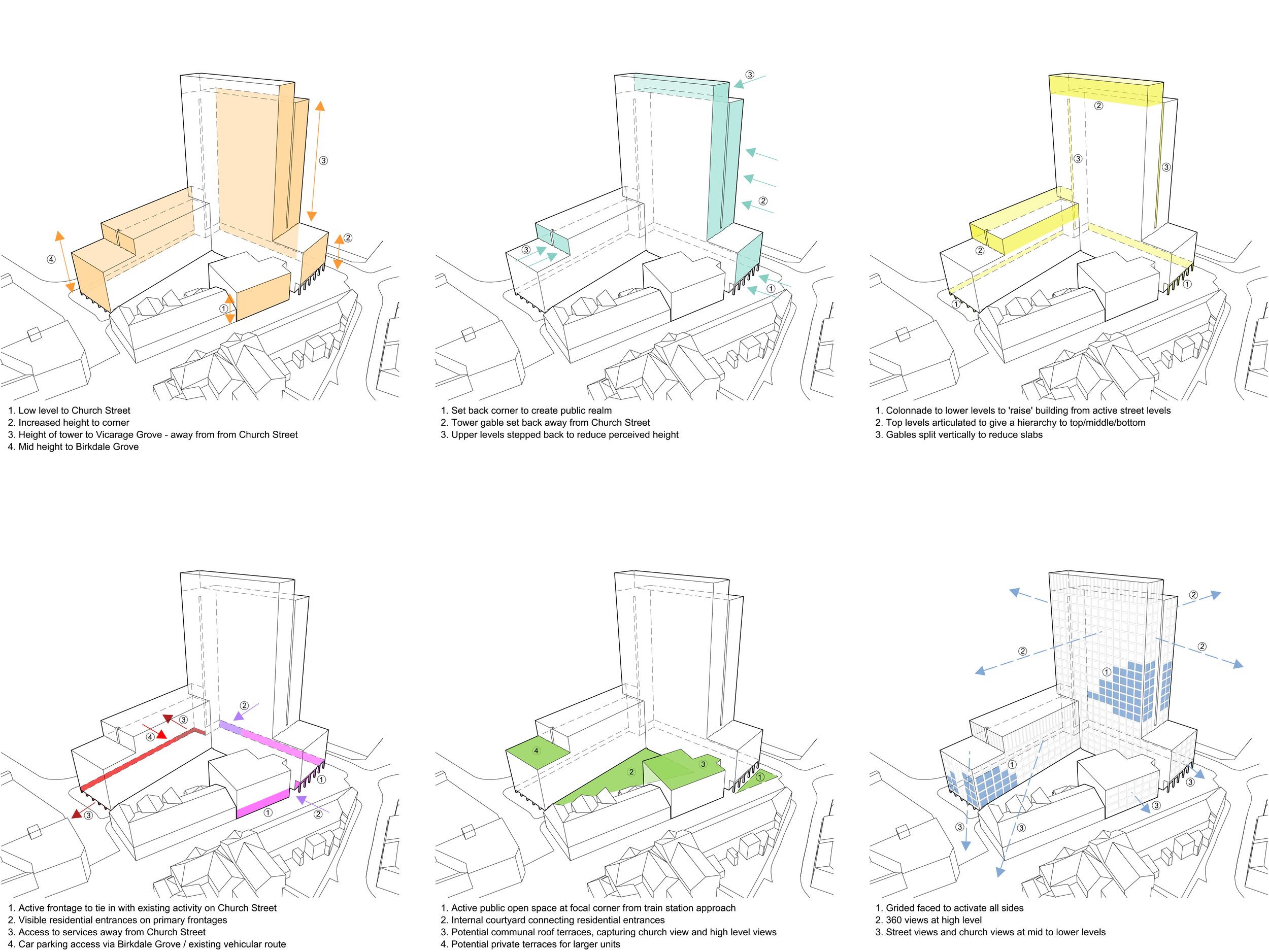 The accommodation takes the form of a ground plus 3 / 4 / 5 storey podium and a tower of ground plus 22 storeys. The podium is three-sided and addresses Church Street, Vicarage Grove and Birkdale Grove. One of the key challenges of the project is how to articulate a meaningful proposal that deals not only with the past and present of the area but also with the immediate future; a proposition that will completely transform the nature of Eccles. This new development will have to mediate between the existing context and issues that will be addressed by the emerging masterplan.