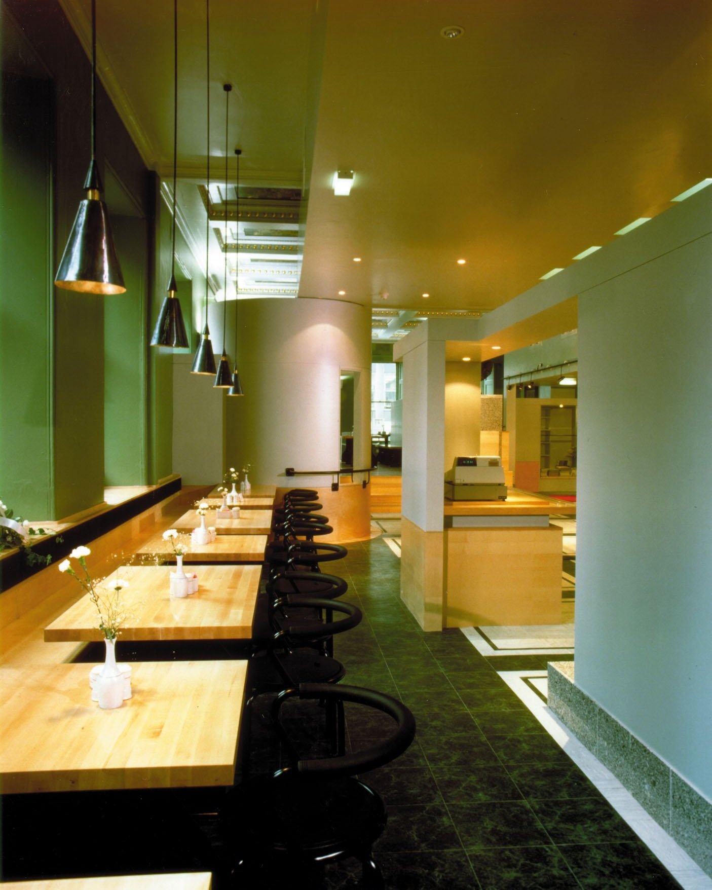 The Gallery Café is located in the City Art Gallery - a Grade 1 Listed building by the architect Charles Barry, who was also responsible for the design of the Houses of Parliament. A cylinder-shaped structure provides access to the bookshop and the café. Two seating sections encircle the servery. One part of the café is on a higher level, from where there is a view of the Waterhouse Town Hall opposite. The café and bookshop, as well as the servery, have been integrated into the historical structure with sensitivity. Black steel cubes on a continuous granite platform look like Victorian range abstractions. Black steel has been used for the glass shelves and the lighting fixtures. Simple, modern elegance underlines the coffered ceiling, the pattern of which is repeated in the vinyl floor covering. Light maple and aluminum Amat Toledo chairs complement the cool austerity.