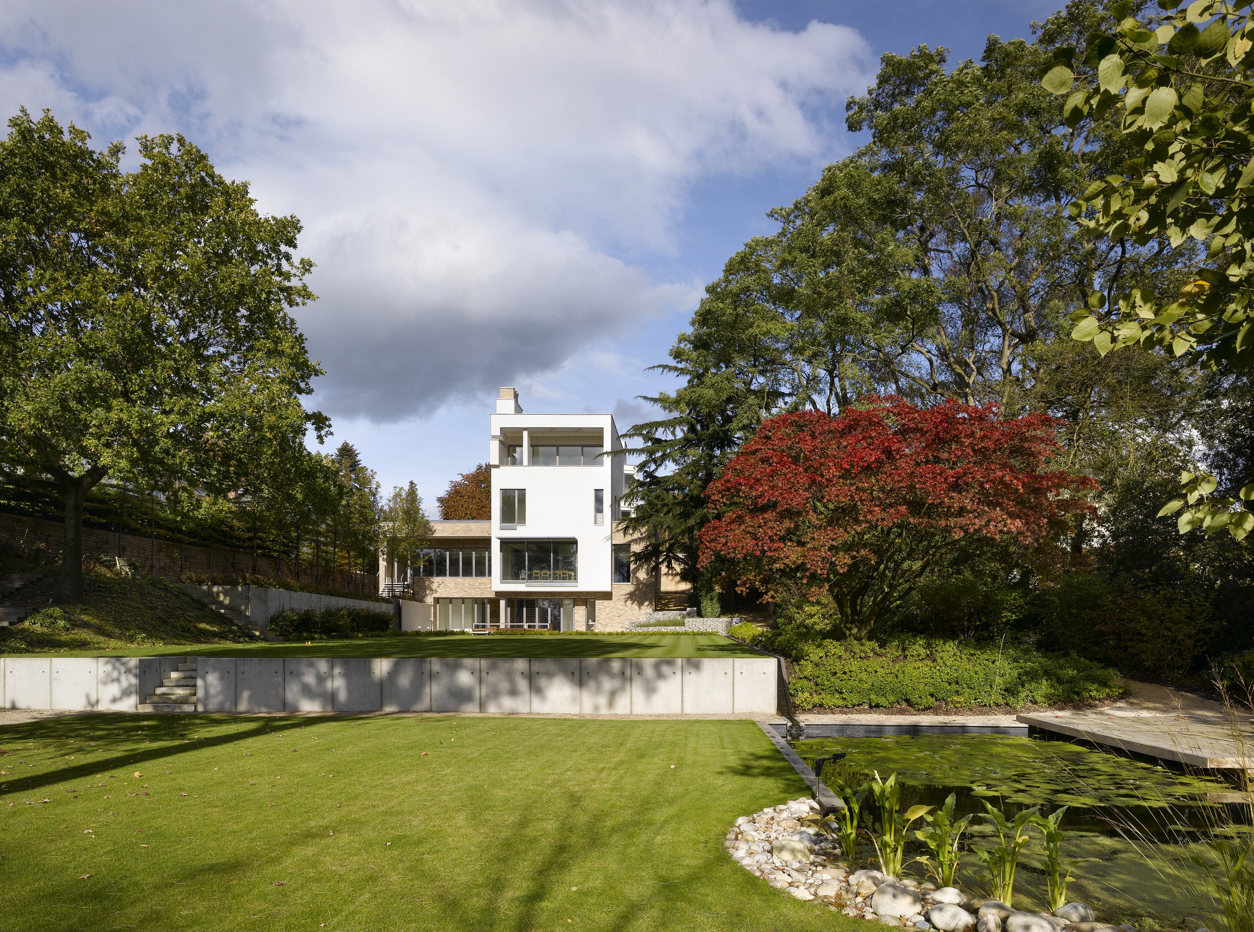 Environmental features such as sedum roofs and underground greywater stores, for irrigation and supply to a natural pool at the bottom of the garden, were complemented by the intrinsic design of aspects such as large areas of south-facing glazing with brise soleil to achieve maximum benefit from passive solar gain.