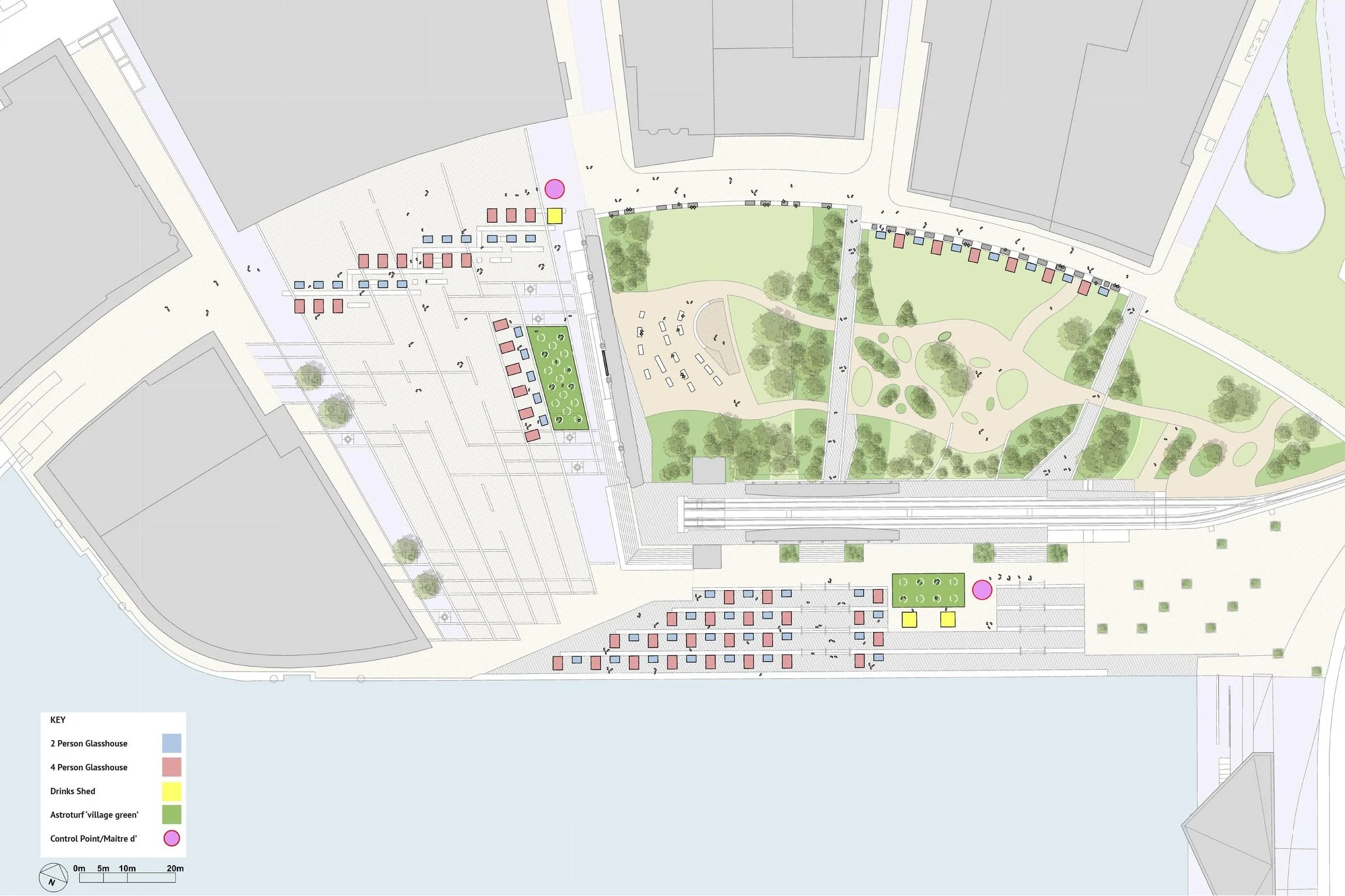 As a counterpoint to the legibility and architectural order of the greenhouses, the piazza village with be greened and planted in a more organic arrangement using herbs and vegetables along with summer flowering plants. Brightly coloured loose furniture adds to the identity and visual excitement.