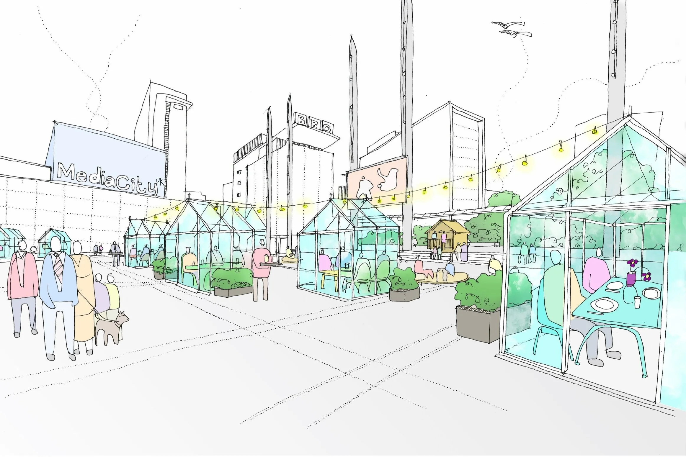 In line with government advice during lockdown and utilising the open-air space in MediaCityUK that was under the control of Peel Media, we prepared a proposal to support restaurant operators in the reopening of their businesses. The idea was to stimulate trade whilst responsible social distance measures were in place and to capitalise on the opportunity to deliver an alfresco dining proposition in a managed public realm space where large gatherings weren’t possible; something traditional urban centres would be unlikely to be able to provide.