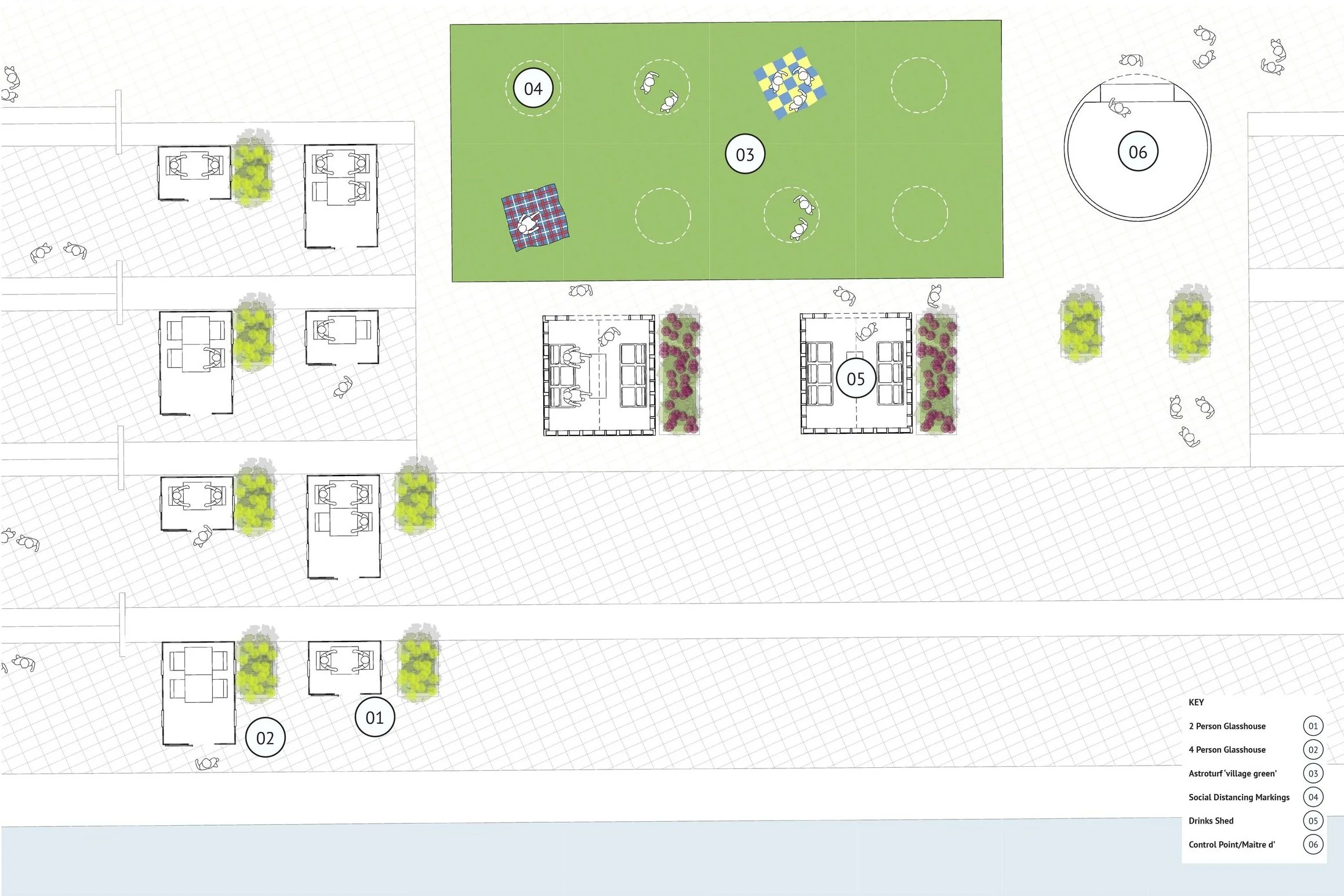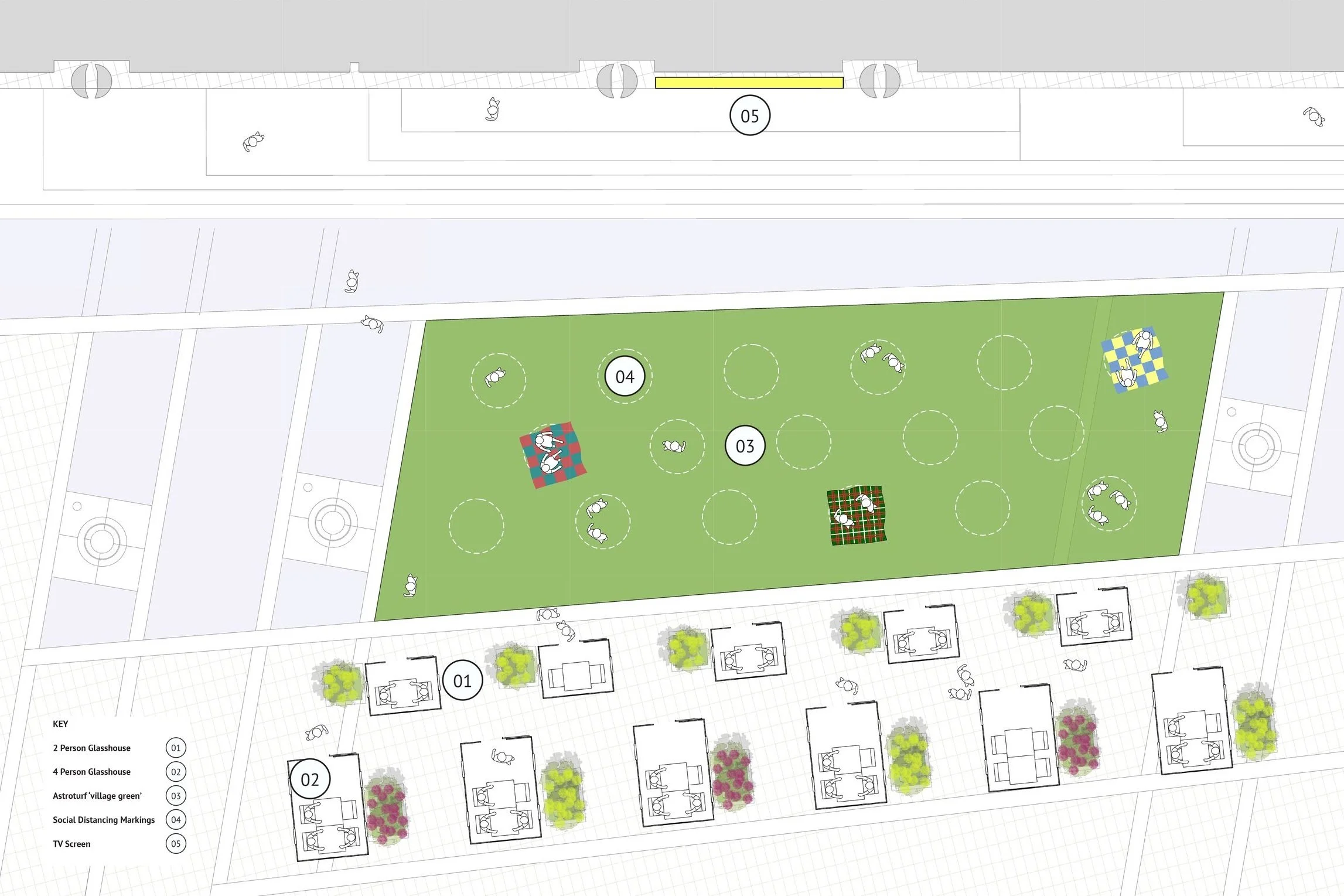 Along with dining pods, a socially distanced astroturfed picnic area is located in the main piazza; combined with dining pods to create a Summer Nights Festival of outdoor film screenings. Bring your own food or book a dining pod.