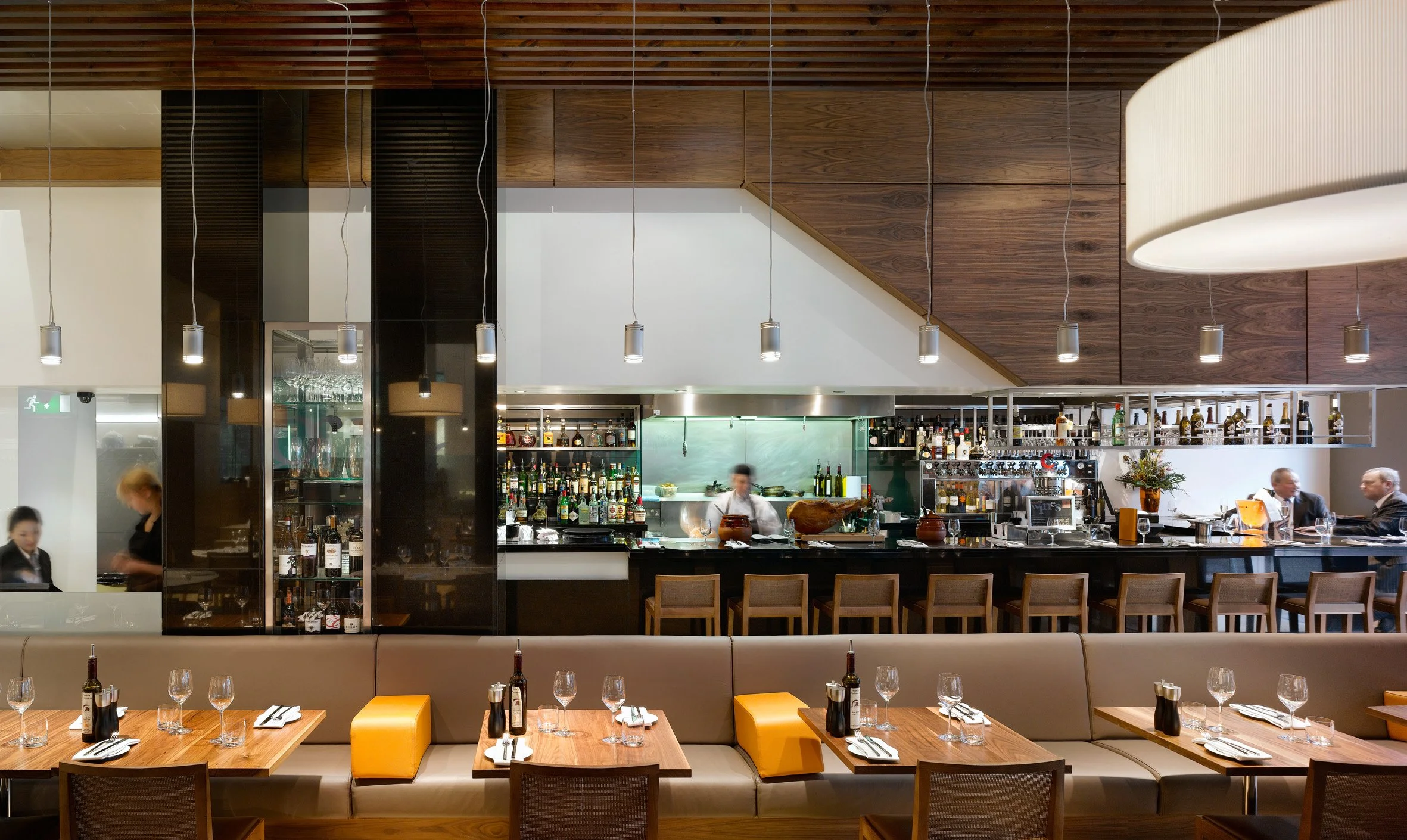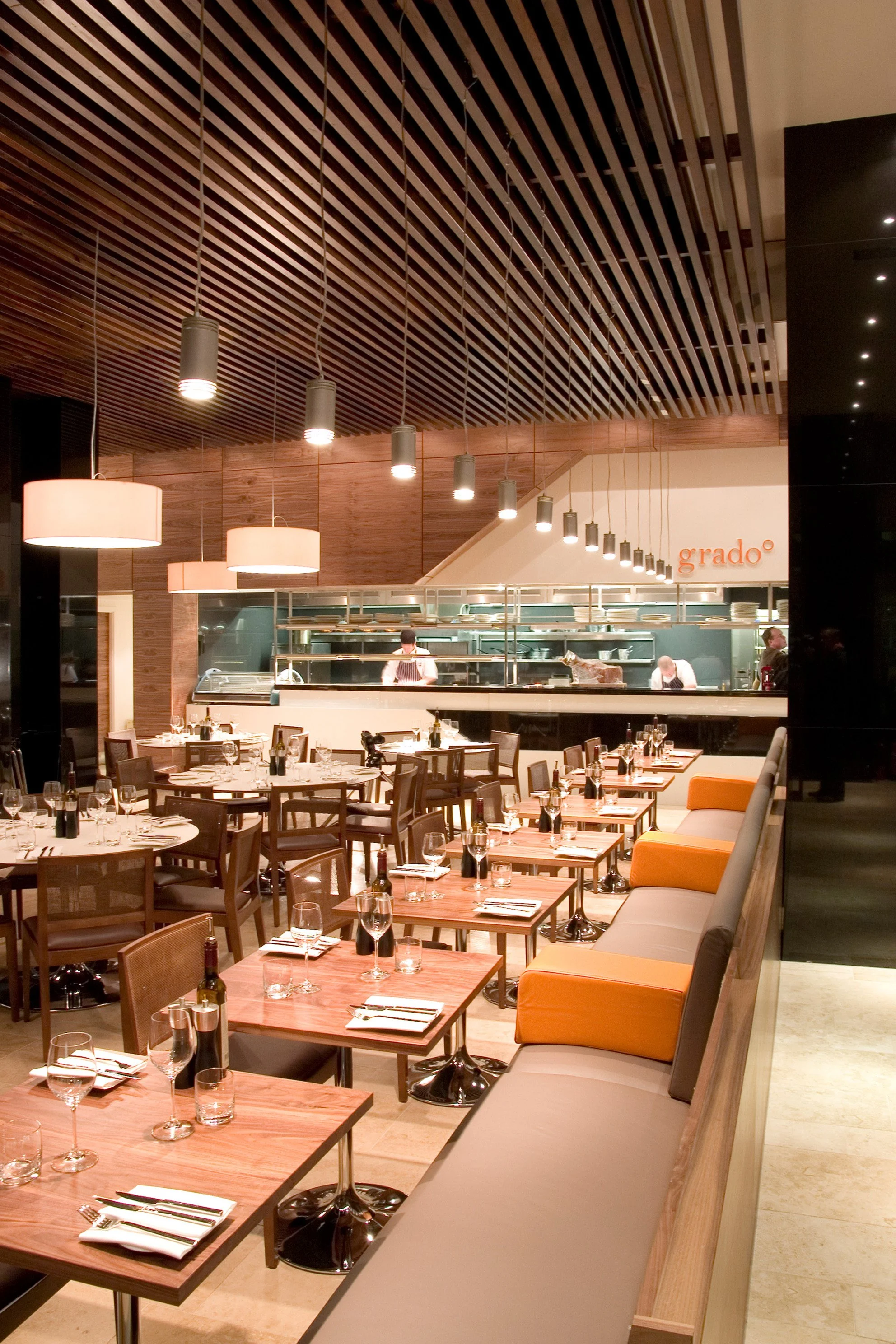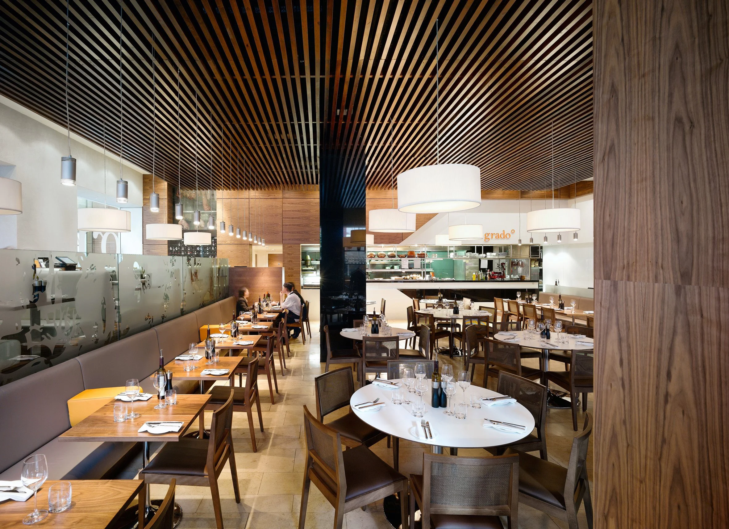 The practice was appointed by Heathcotes Restaurants to design a high end Spanish restaurant in the heart of Manchester’s city centre, the first of its kind in the Heathcotes’ portfolio. The concept from the outset was to design a bright, contemporary and welcoming space where guests could enjoy anything from a glass of wine to a four-course meal. The mix of banquette seating, booths and centre-floor tables sit comfortably against the contemporary design which combines a rich pallet of timbers, natural stones and plush leathers. Lighting is supplied by large ivory pendants which provide an intimate atmosphere against a backdrop of American Walnut above the kitchen and bar areas. The front-of-house “theatre” kitchen allows diners to experience the excitement of the kitchen which sits adjacent to an informal bar area where pre-dinner drinks and tapas are served. An efficient use of space (335m²) means 120 covers can be comfortably accommodated alongside the kitchens, bar, storage rooms, toilets, staff areas and feature fridge display. The latter of which dominates the raised dining area overlooking the recently completed Piccadilly Mall where a sympathetic use of materials gives the two spaces a visual homogeny. A flagship of the Heathcotes’ brand, Grado set a new precedent in city centre dining.
