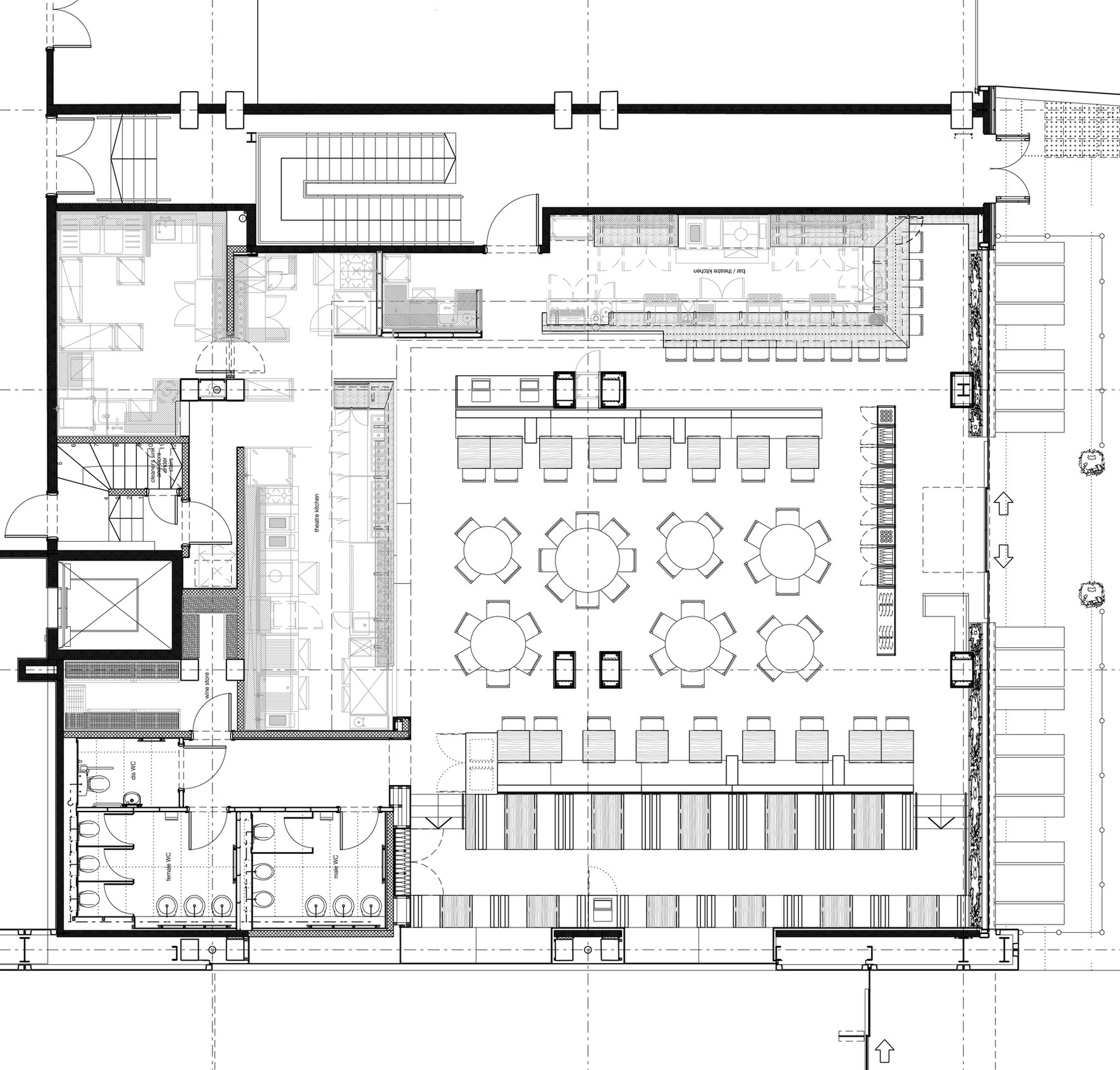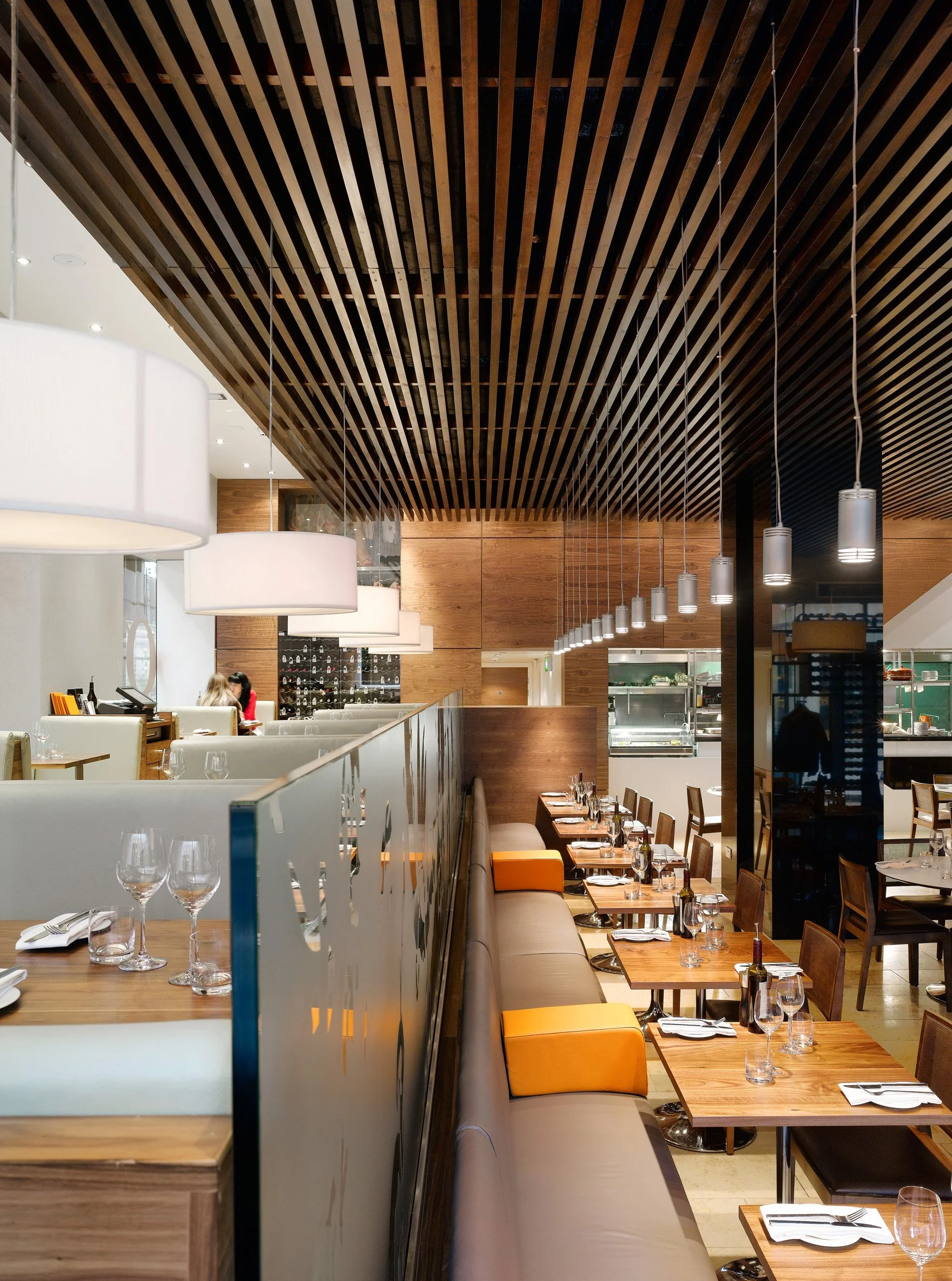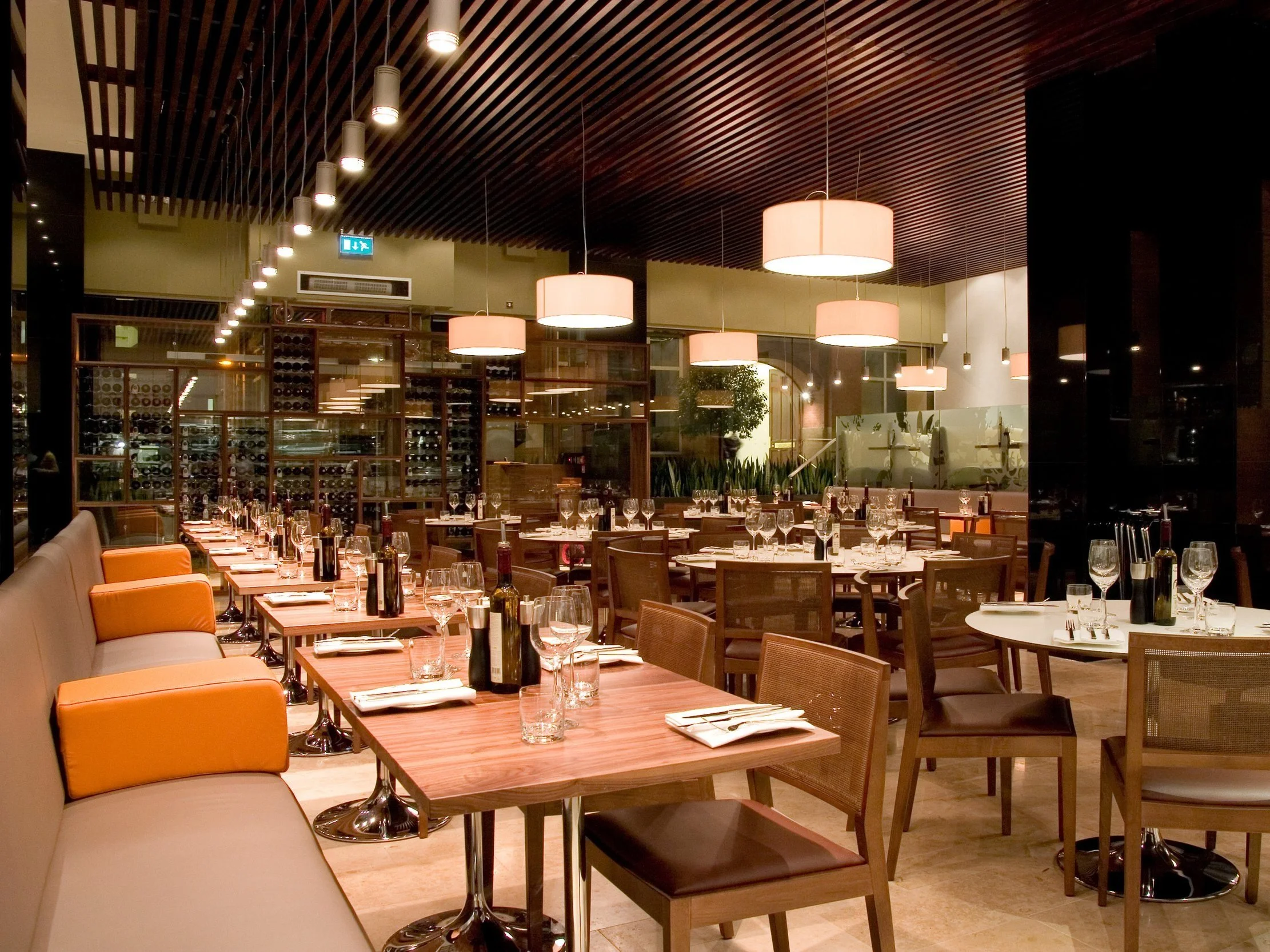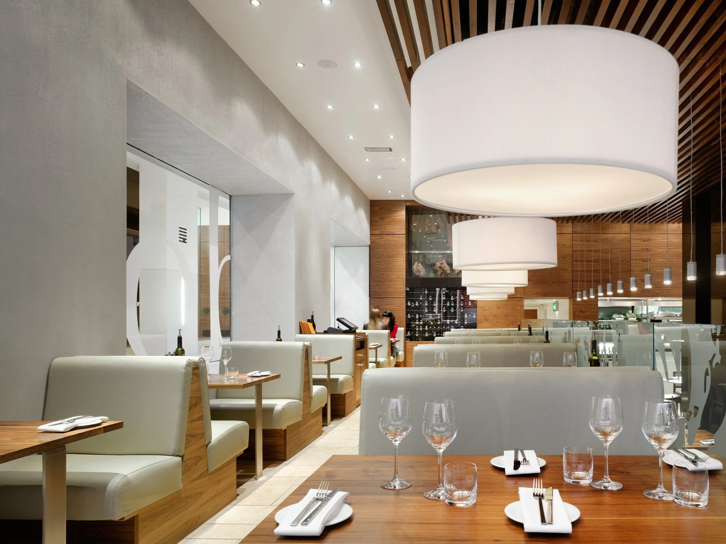 The practice was appointed by Heathcotes Restaurants to design a high end Spanish restaurant in the heart of Manchester’s city centre, the first of its kind in the Heathcotes’ portfolio. The concept from the outset was to design a bright, contemporary and welcoming space where guests could enjoy anything from a glass of wine to a four-course meal. The mix of banquette seating, booths and centre-floor tables sit comfortably against the contemporary design which combines a rich pallet of timbers, natural stones and plush leathers. Lighting is supplied by large ivory pendants which provide an intimate atmosphere against a backdrop of American Walnut above the kitchen and bar areas. The front-of-house “theatre” kitchen allows diners to experience the excitement of the kitchen which sits adjacent to an informal bar area where pre-dinner drinks and tapas are served. An efficient use of space (335m²) means 120 covers can be comfortably accommodated alongside the kitchens, bar, storage rooms, toilets, staff areas and feature fridge display. The latter of which dominates the raised dining area overlooking the recently completed Piccadilly Mall where a sympathetic use of materials gives the two spaces a visual homogeny. A flagship of the Heathcotes’ brand, Grado set a new precedent in city centre dining.