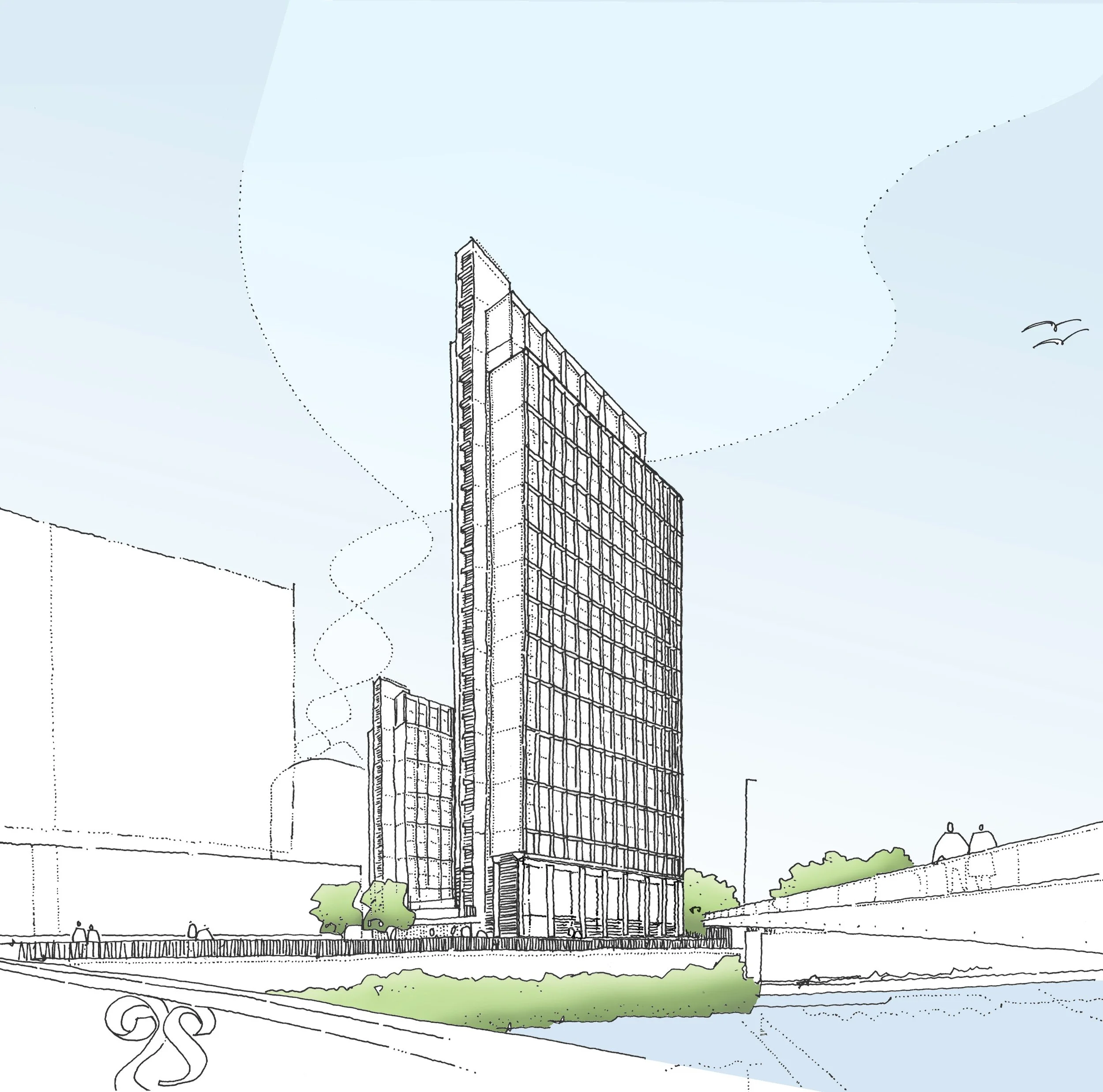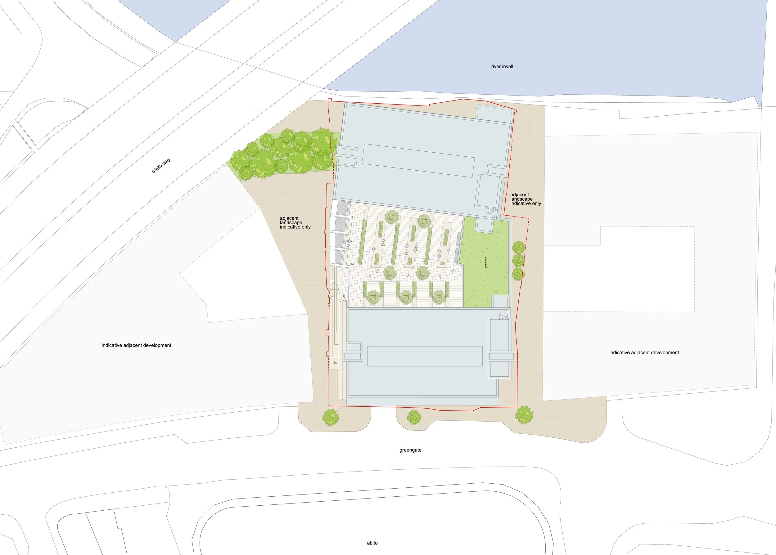 The podium and Greengate tower address Greengate “square on”, whereas at the riverside, the podium and tower are canted to respond to the change in direction of the river. This provides a more dynamic relationship between the two blocks and creates more open aspect to the river corridor to the north.