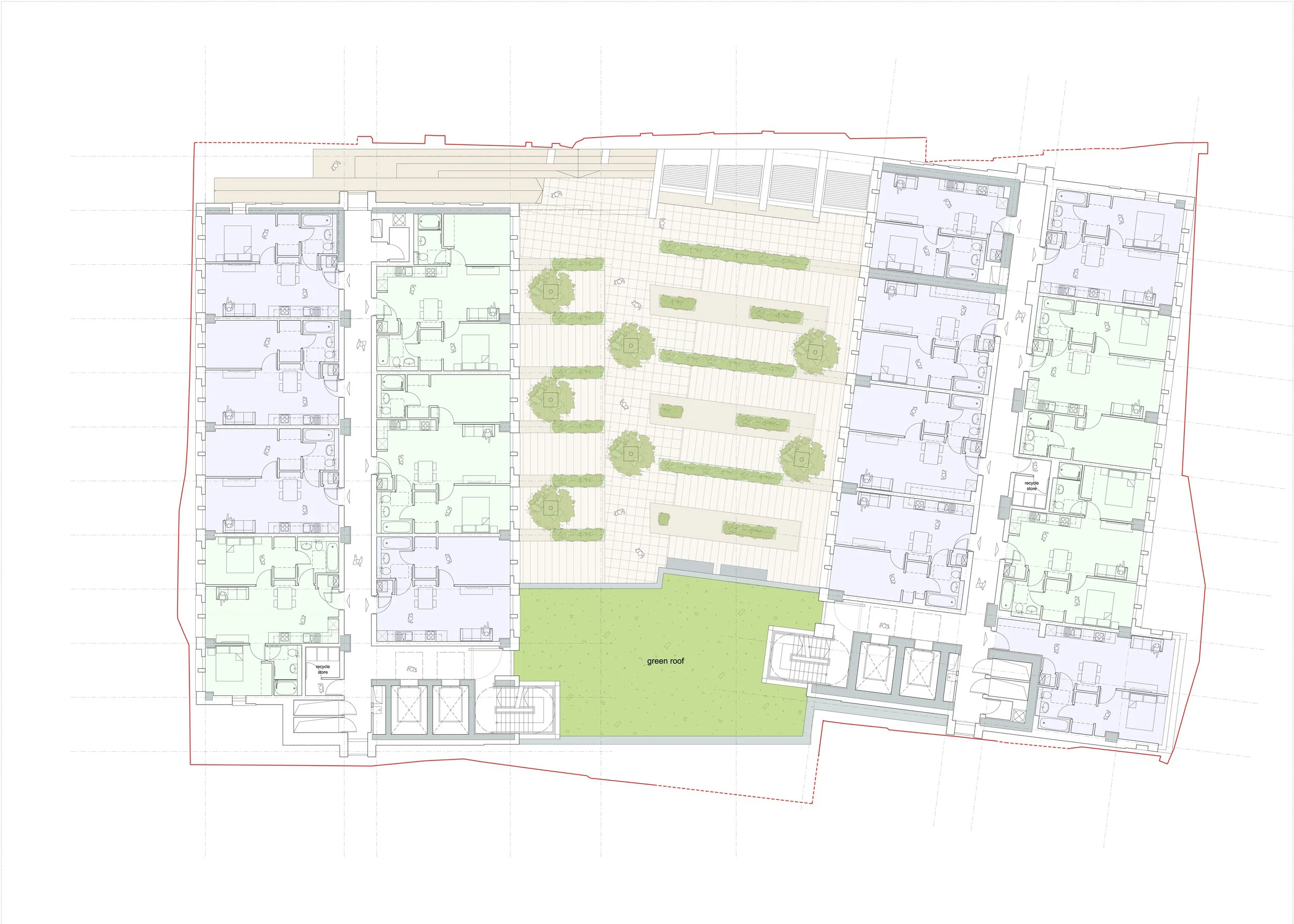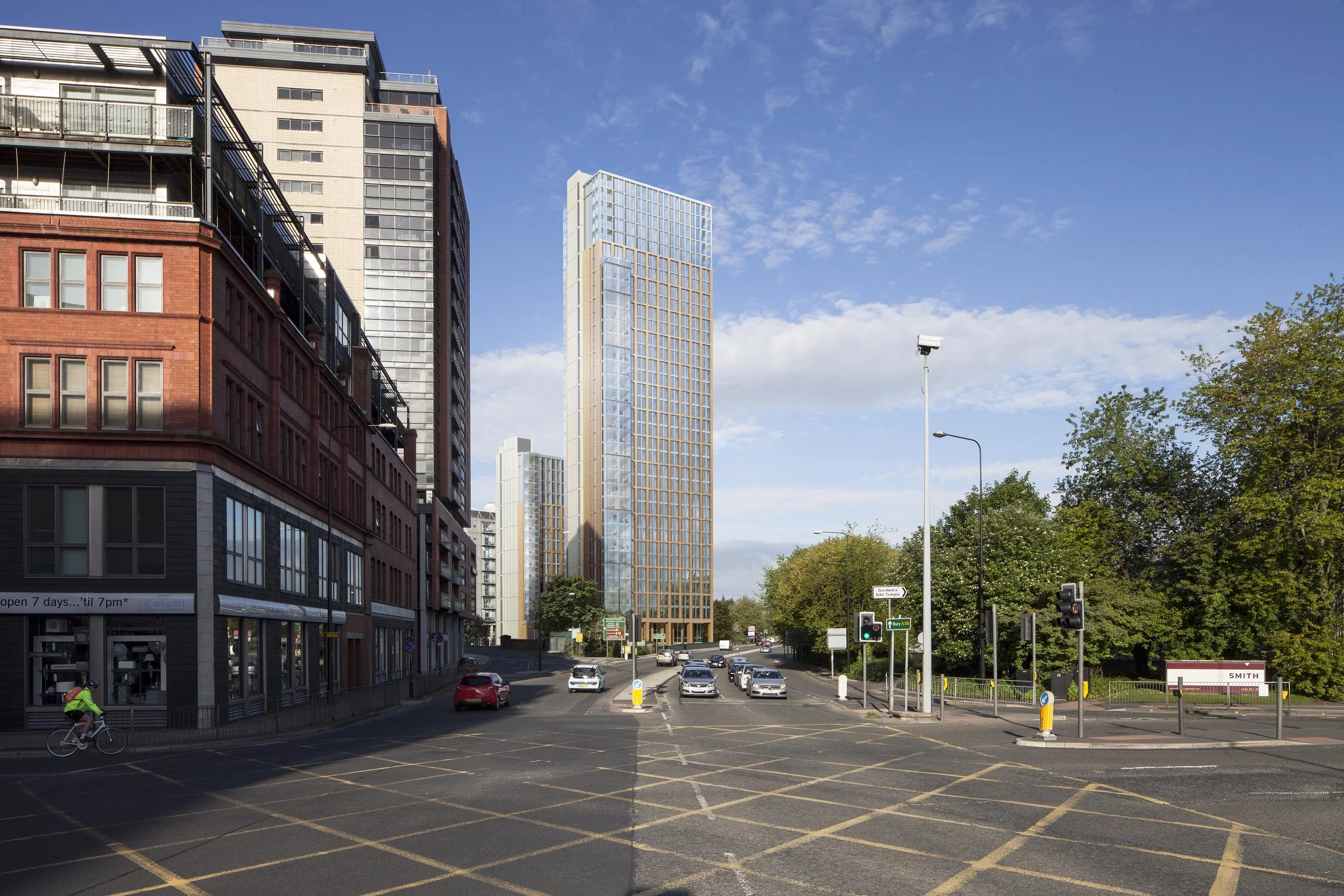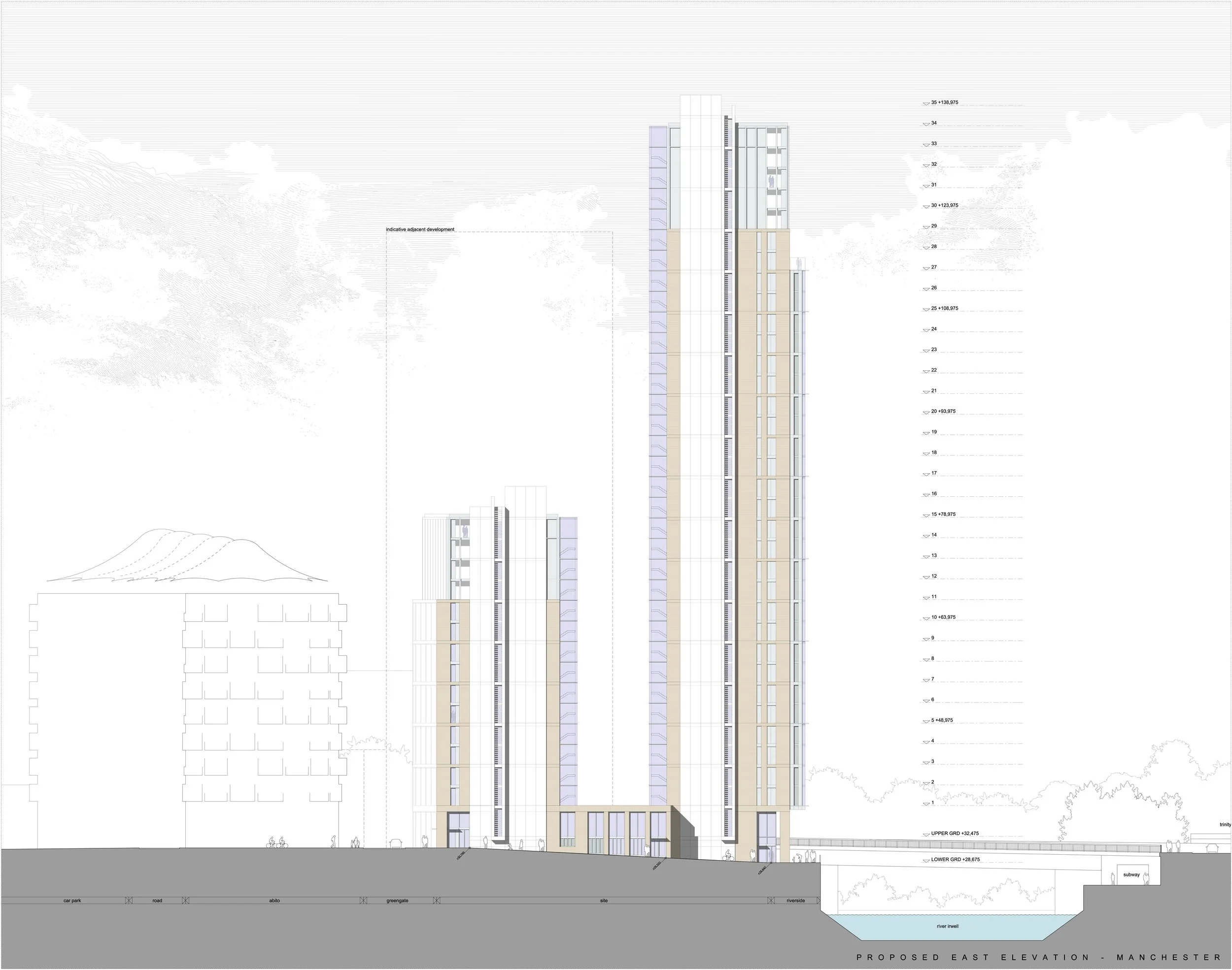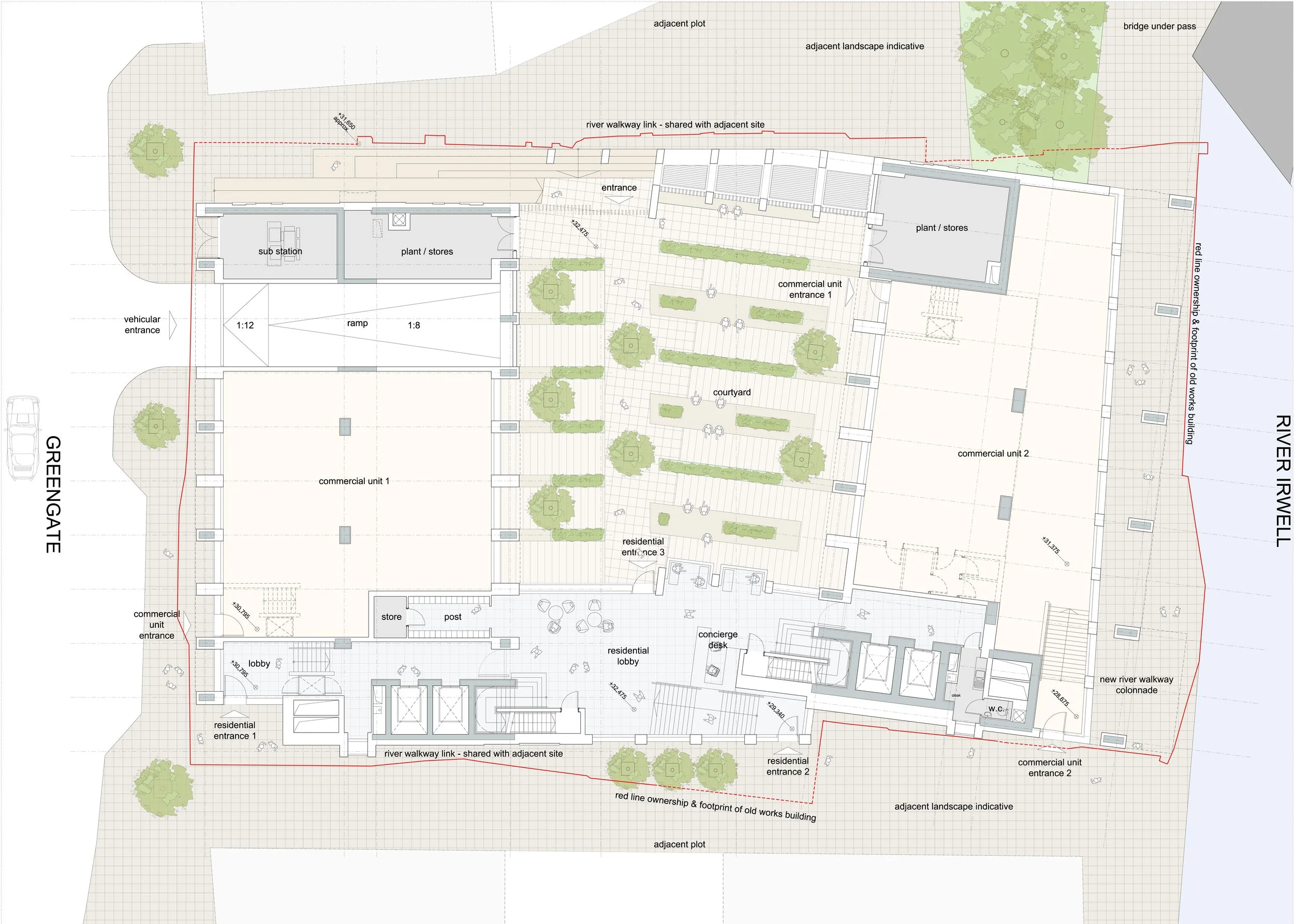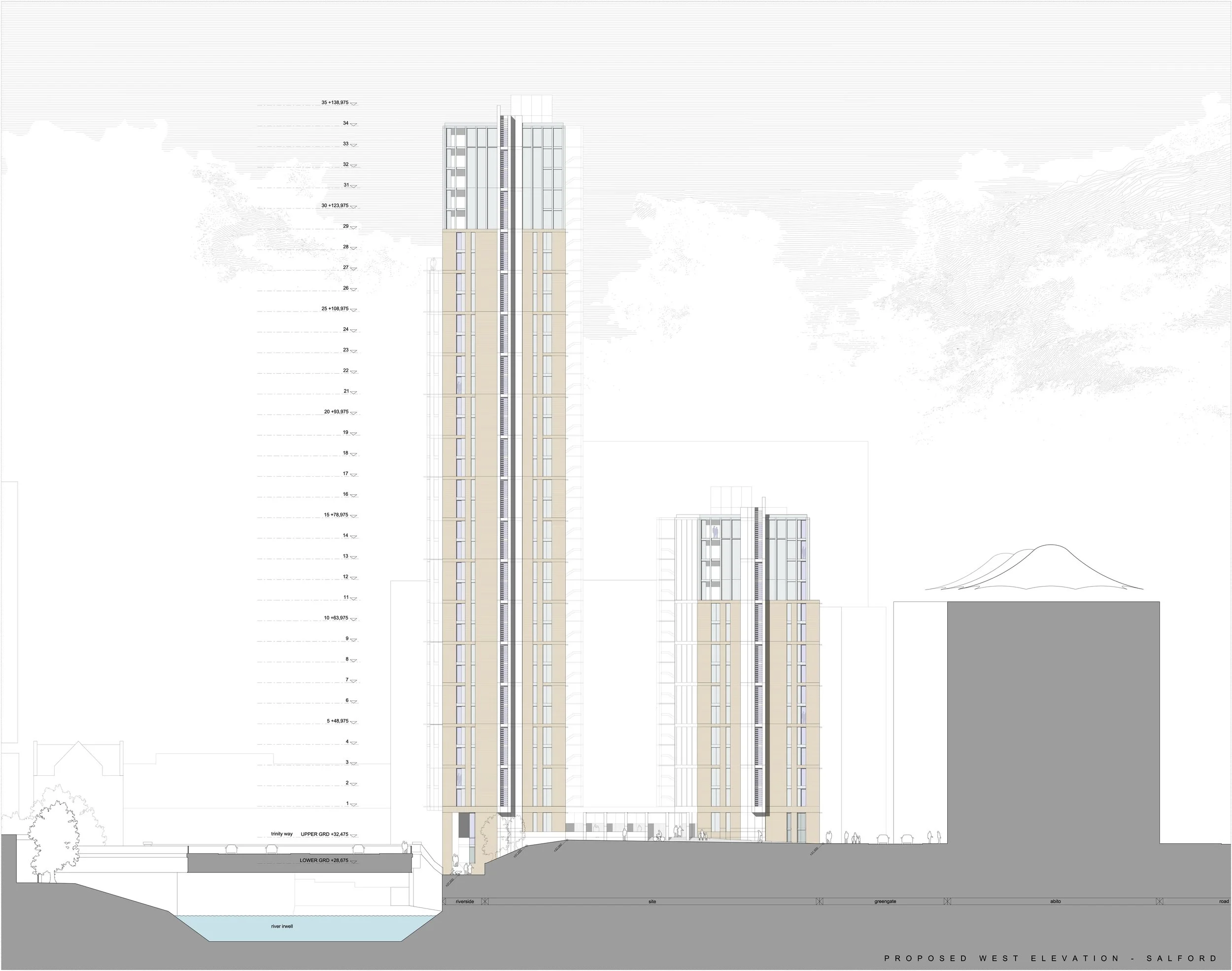 The adopted strategy is a podium surmounted by two slender slab forms; one addressing Greengate and one addressing the River Irwell. The podium roof creates a subsidiary Square for the enjoyment of the occupiers. The resulting layout and urban grain is more attuned to the historic pattern of Greengate’s adjacent streets and reinforces the importance of Greengate and the River Irwell.