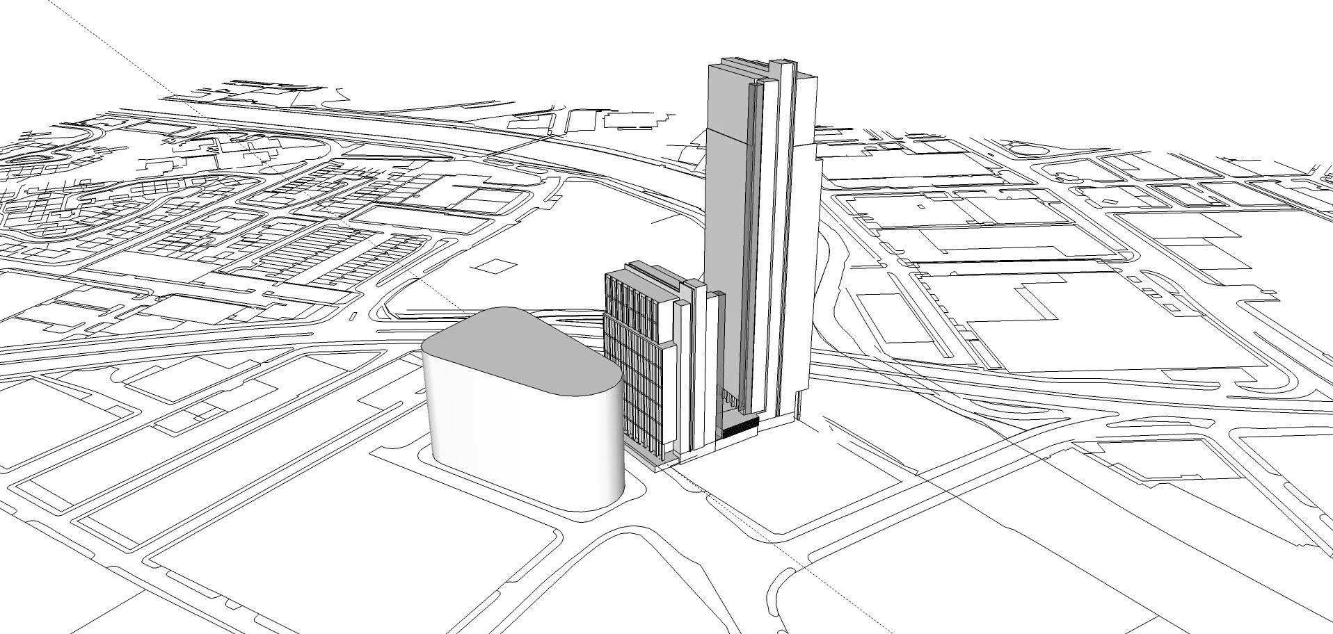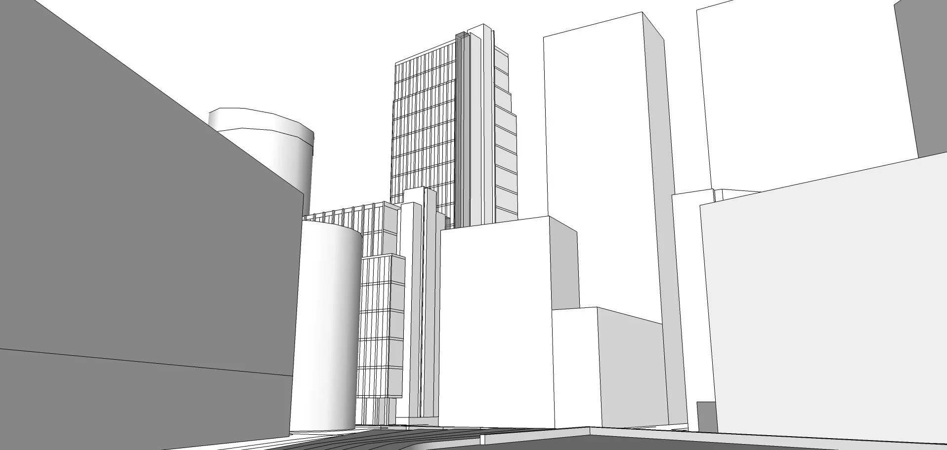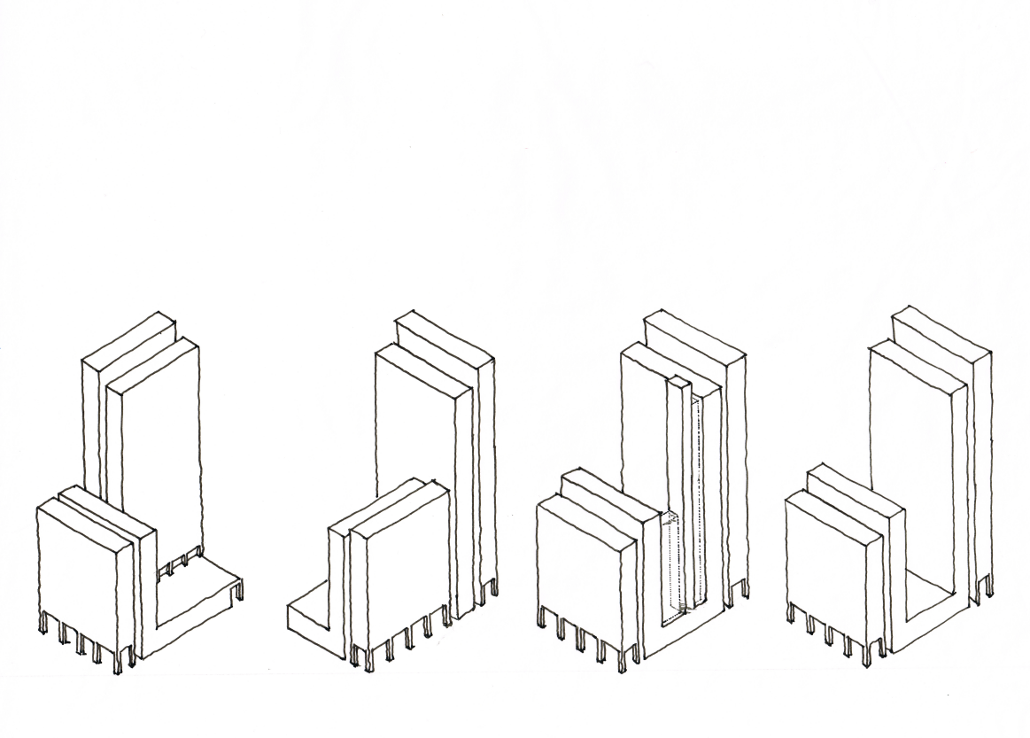 The base is expressed as a colonnade all around and provides a sturdy platform from which the towers rise. The main body of the towers, expressed as a repeat grid, communicates an honest expression of the plan form behind.