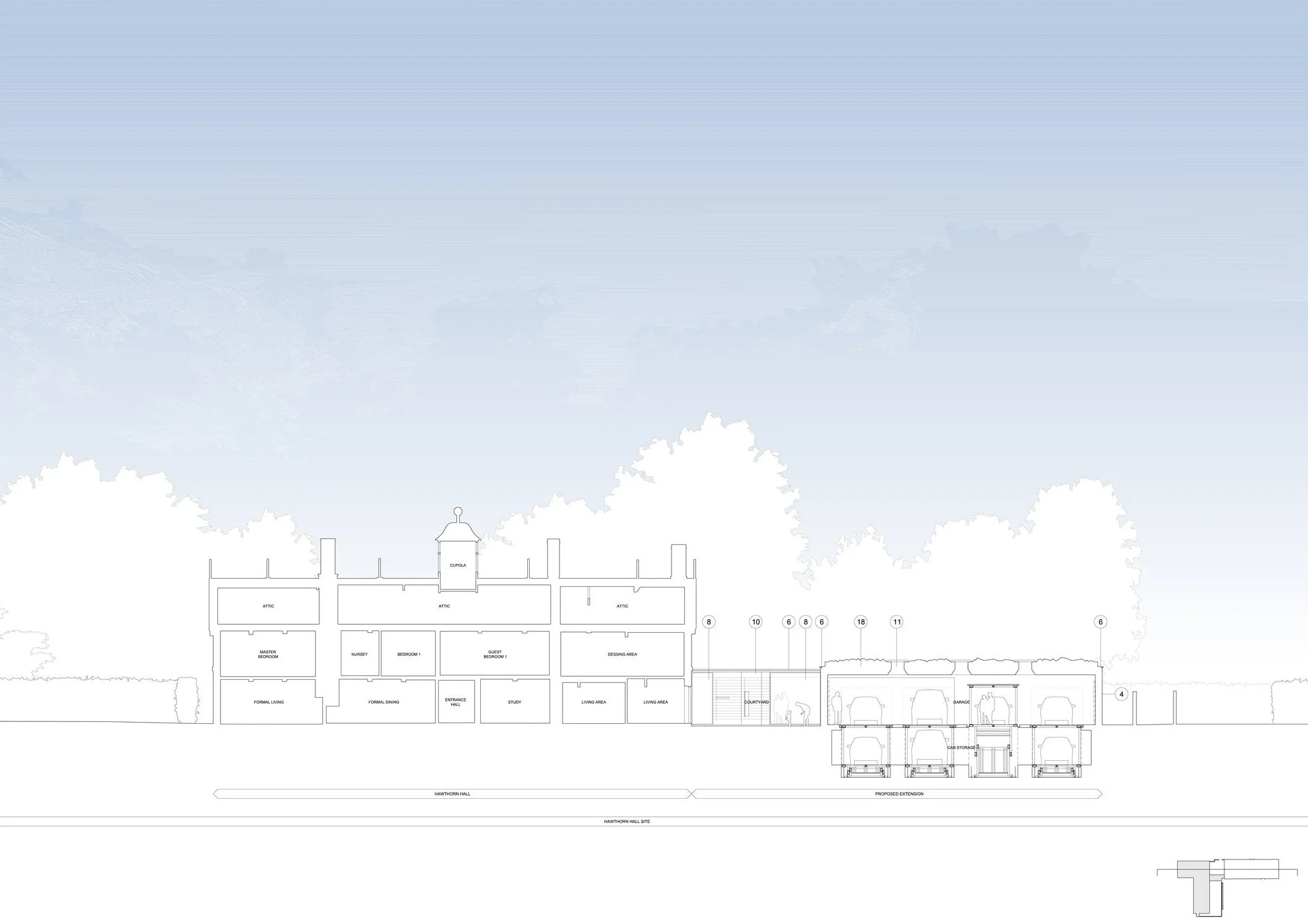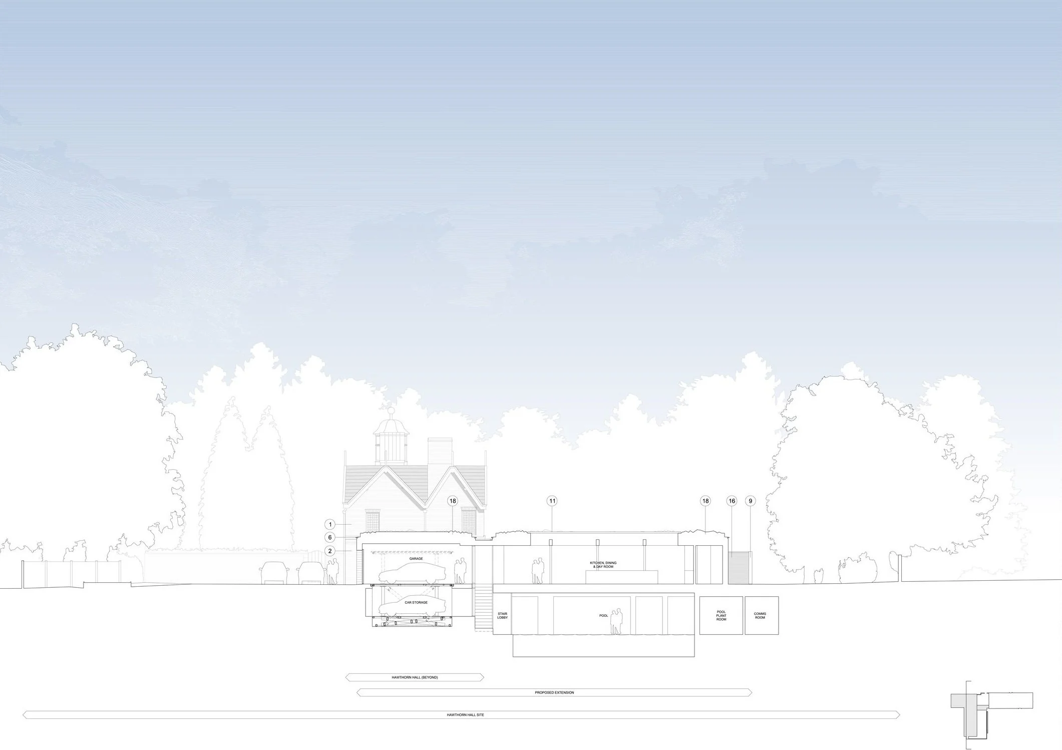The existing hall’s linear plan is fundamentally symmetrical consisting of a series of cellular spaces. The existing extension connects via a link corridor and forms an L-shaped plan housing the garage space to the North and living and plant space within the southern leg.