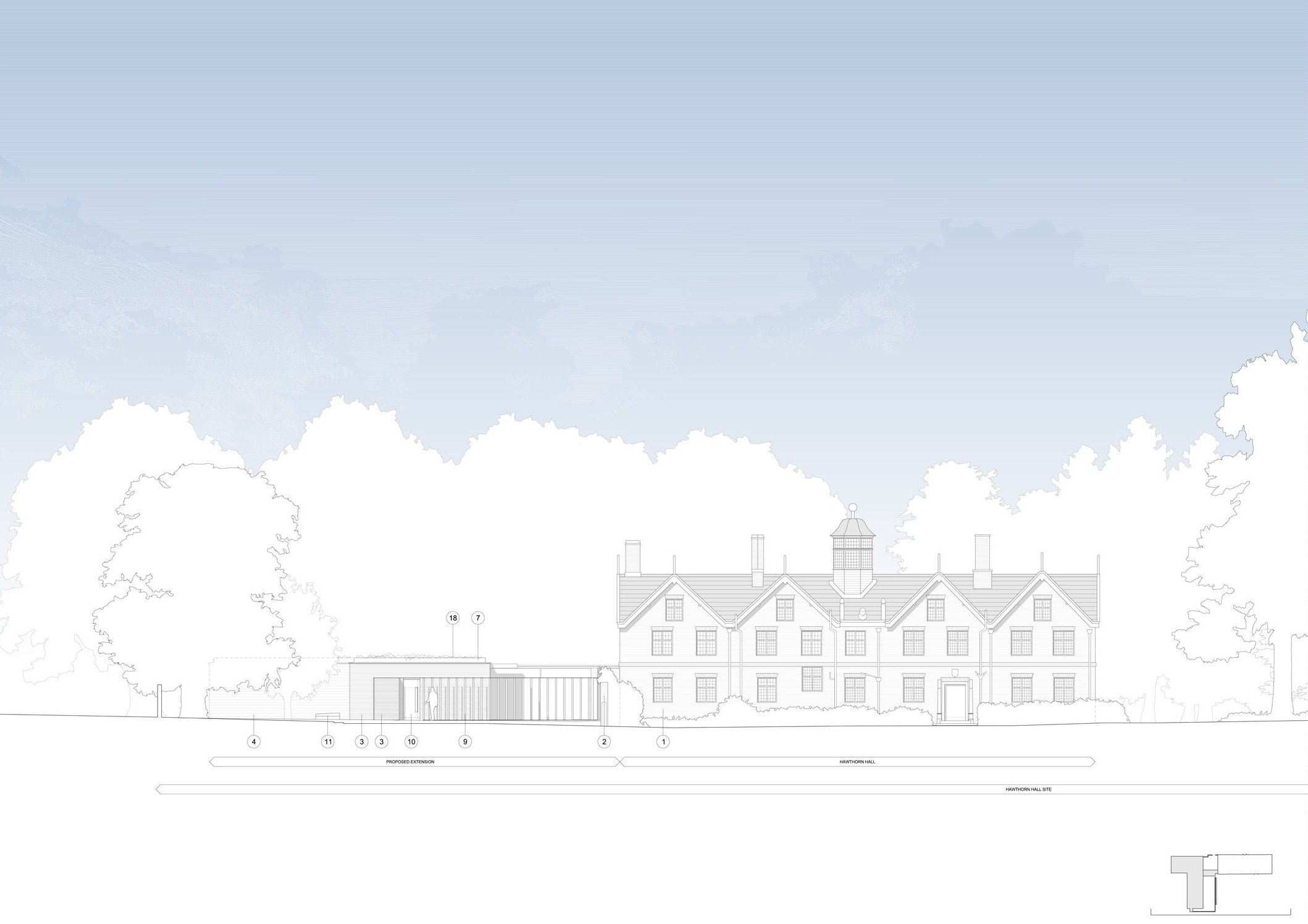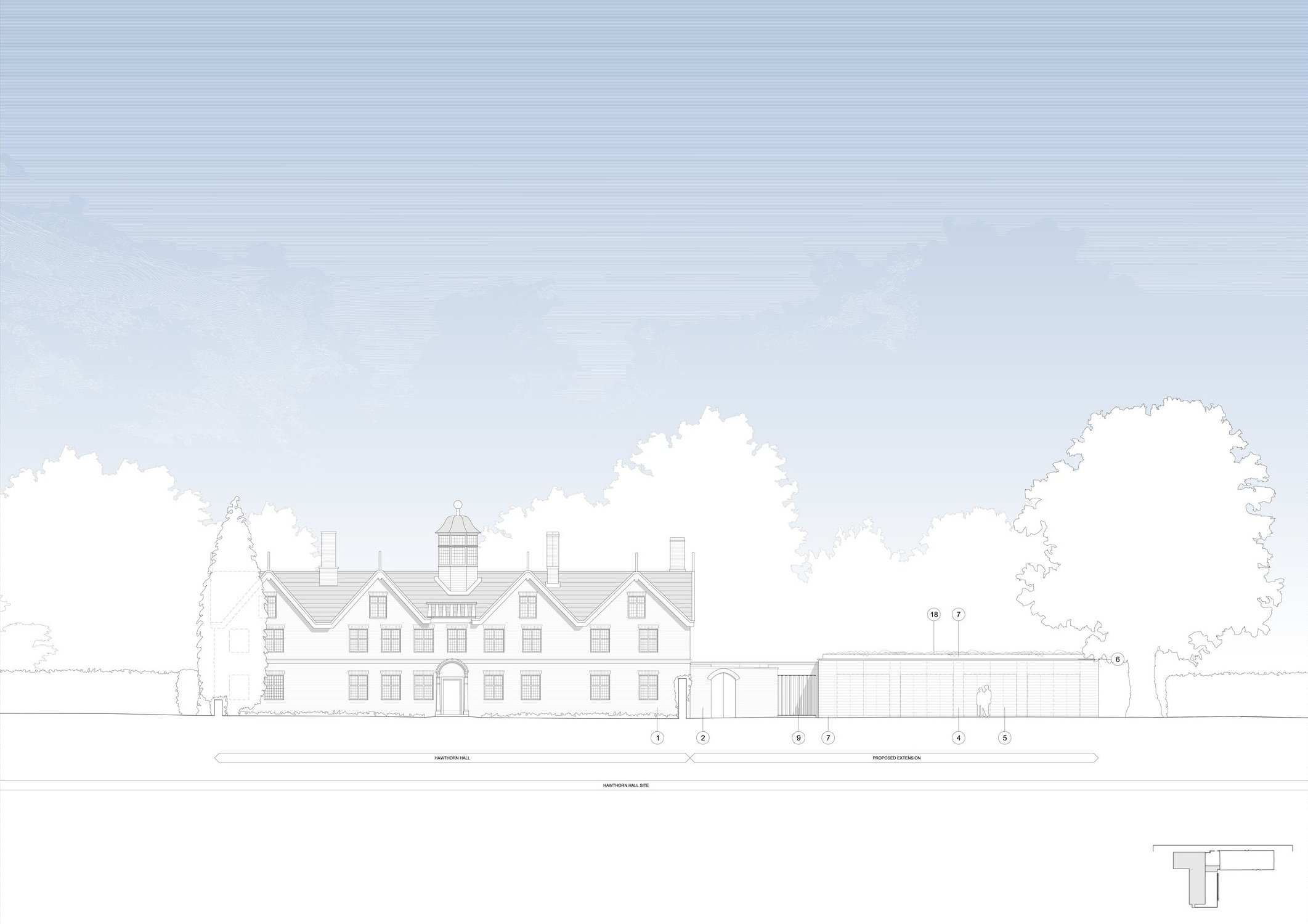Hawthorn Hall is a Grade 2 Star listed manor house that dates from the 17th century; it is located within a Conservation Area. It was originally the centre of a farm estate; however, by the beginning of 20th century, much of the land had been sold off for housing and the Hall is now located within smaller grounds, nestled within a suburban setting. Hawthorn Hall is set centrally within an irregularly shaped site bounded by a mixture of detached and semi-detached dwellings to the north, south and west; on the eastern is a private road - Hall Road. The house and its surrounding grounds are hidden from public view by large mature trees, bushes and boundary walls. The gated site entrance is from Hall Road and the approach to the house is via a sweeping path which offers glimpses of the house across lawns, low-level walls and soft planting.