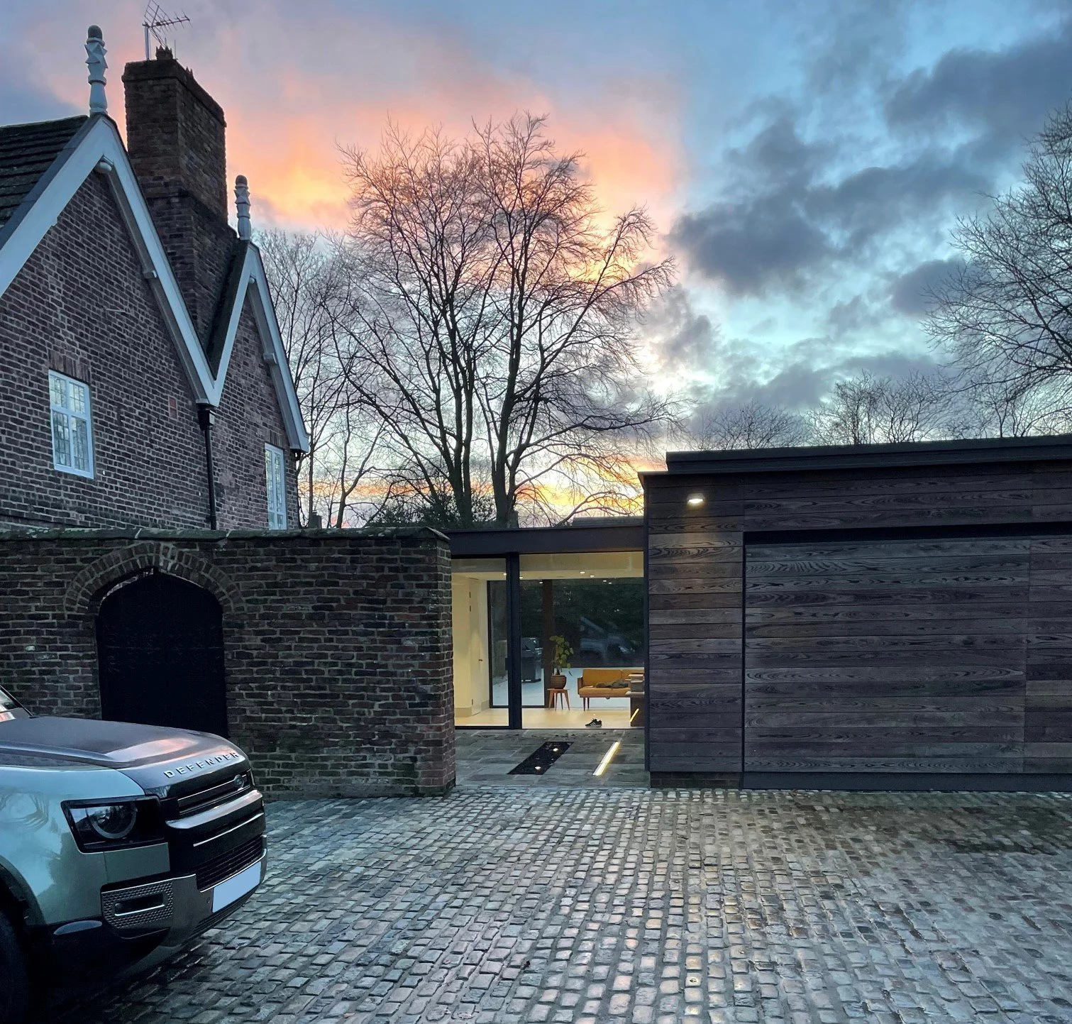 The form of the extension emerged as two distinct and identifiable blocks for the garage and the living accommodation with a clear visual separation between the new intervention and the listed building, allowing the Hall to be read as an individual mass. The two new blocks are linked by a clear glazed linking corridor which ties the Hall and the additional accommodation together visually. The simplicity of the extension is an appropriate contemporary response to the Hall, creating well-detailed simple forms that don’t visually compete with the more complex and highly decorative Hall.