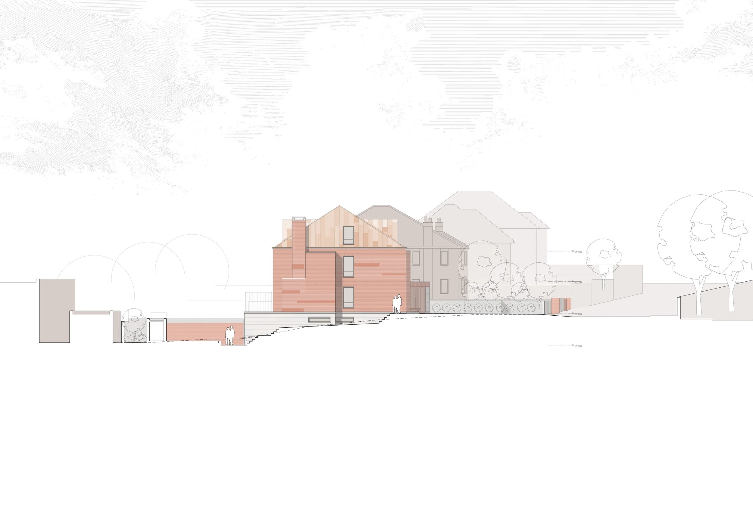 Sobriety and with careful consideration of proportion; on the street this is a two-storey villa with single-storey stone element projecting forward of a brick volume, engaging with the street. The street, the pavement, the gate, the front garden and the bay are all part of varying degrees of the experience and add significantly to the urban streetscape. The proposal emphasises those elements that protrude from the façade and form the rhythms and modelling typical of so many of London's domestic streets. The form is simple and elegant. Urbanistically, it makes an important gesture.