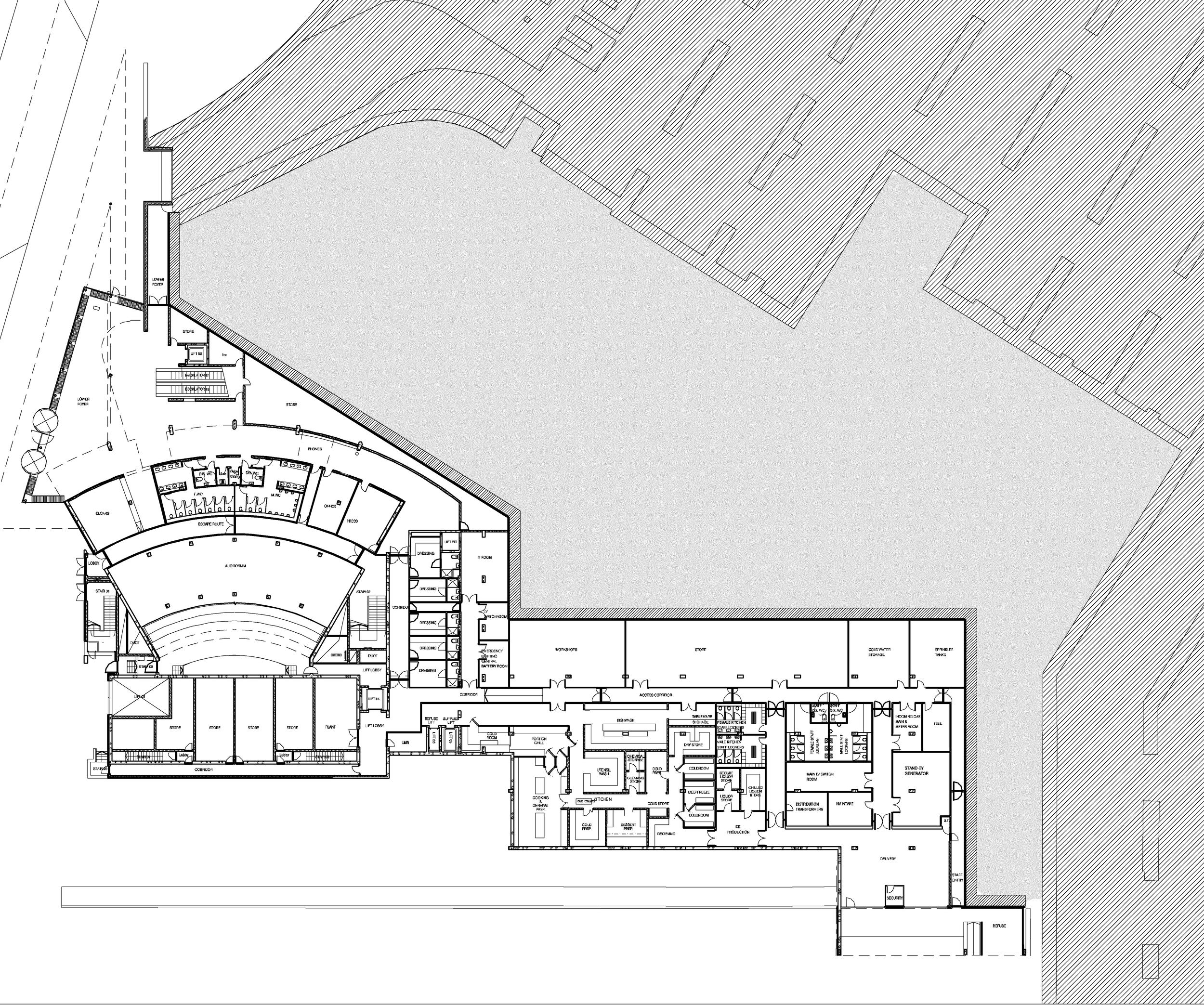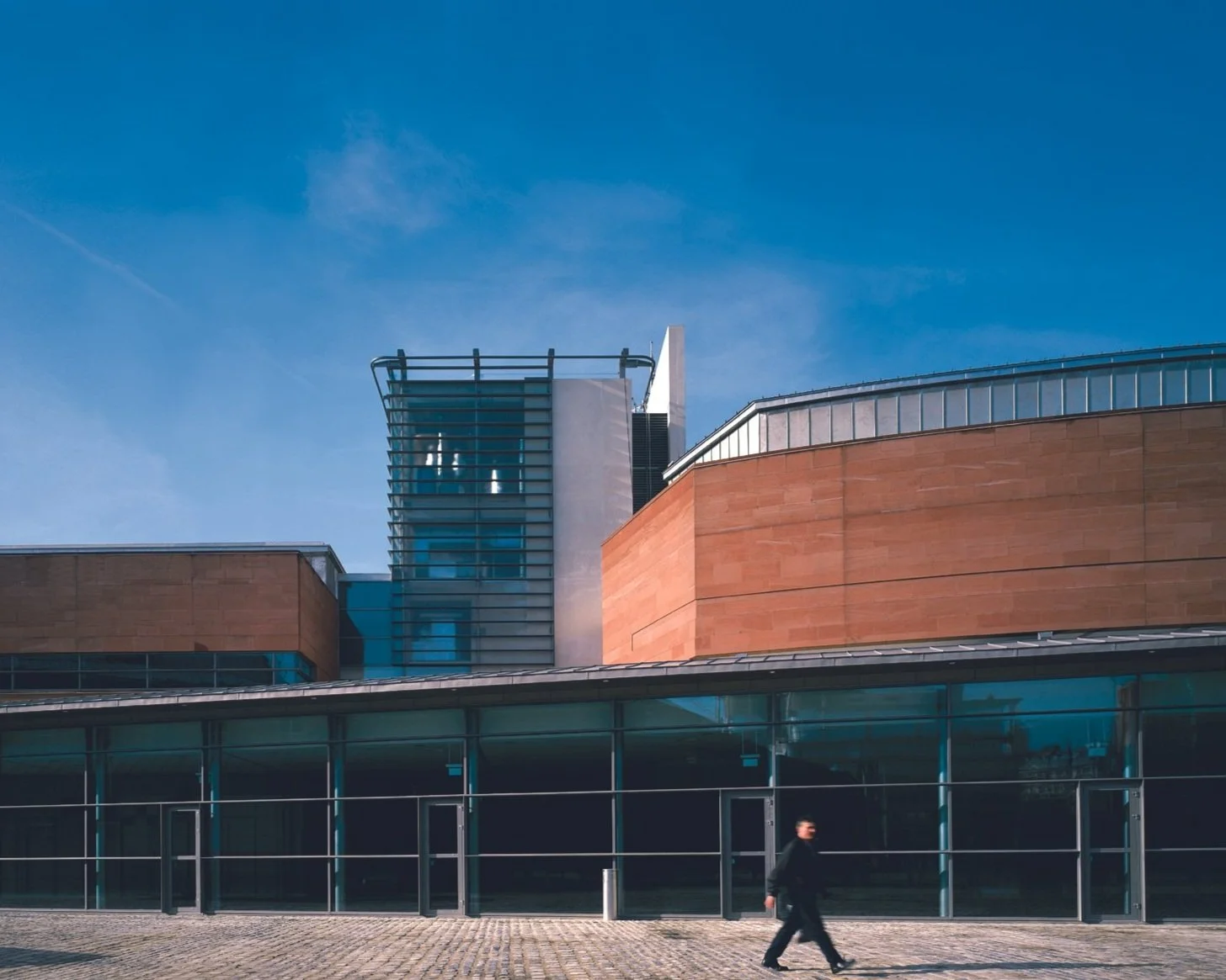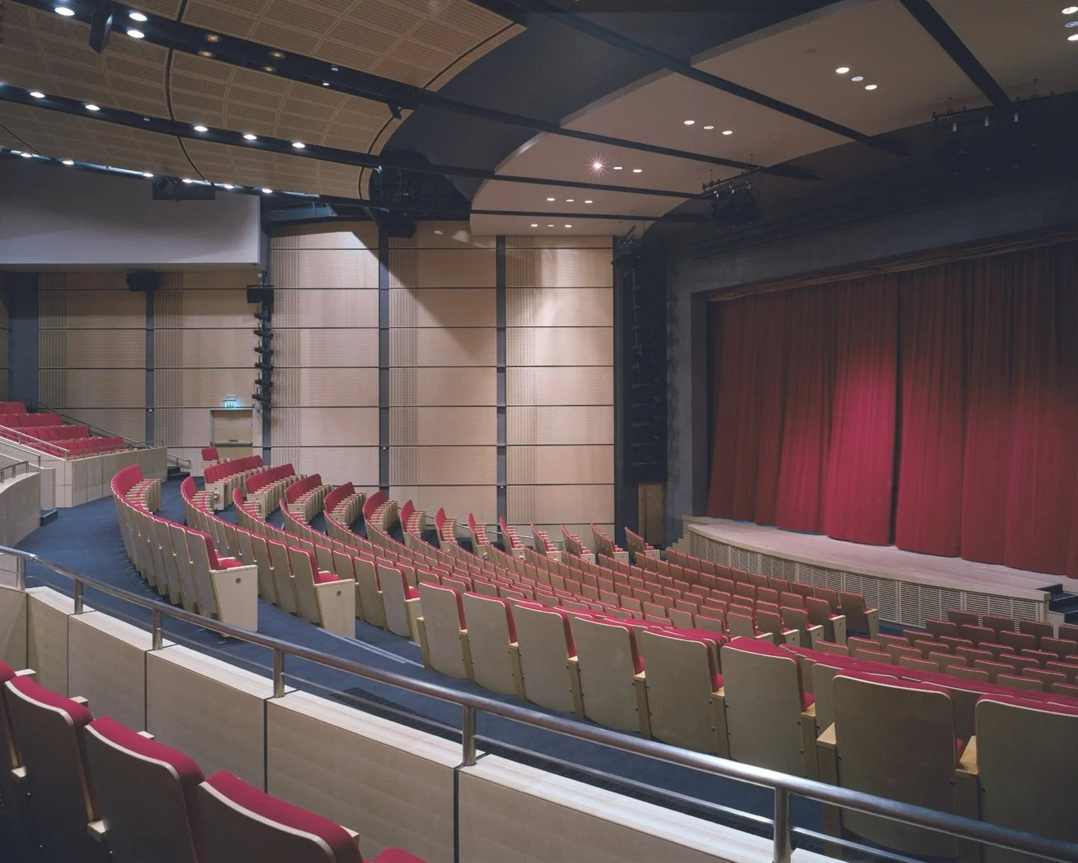 The fan form of the auditorium, generated by acoustic studies for speech rather than music, is expressed externally as a homogenous red sandstone form crowned with a metal roof. This form dominates the approach elevations rising above the public foyers allowing a teasing glimpse of underbelly fully revealed internally.
