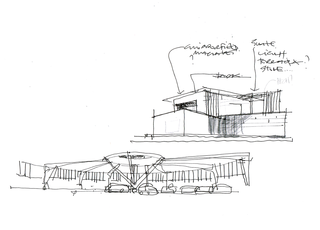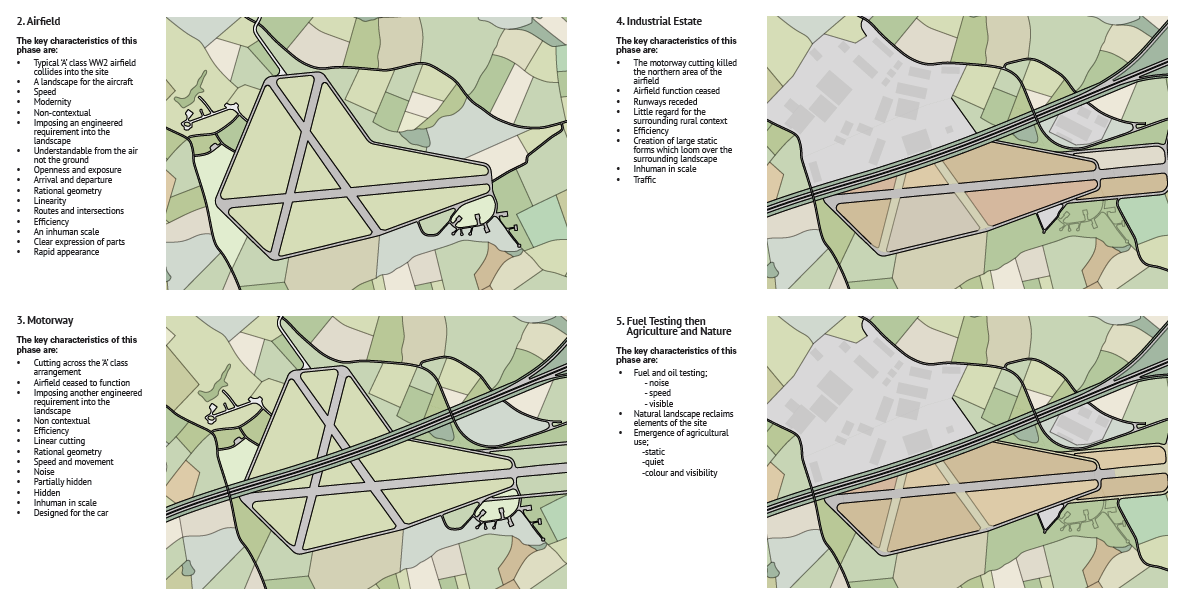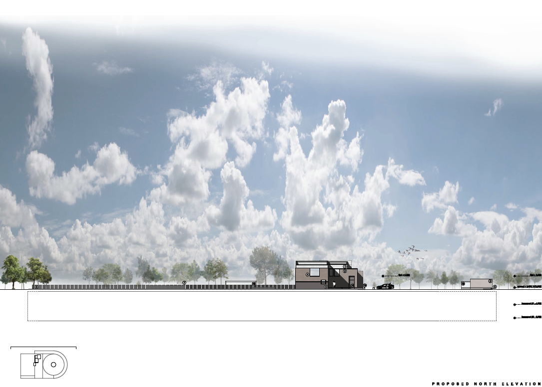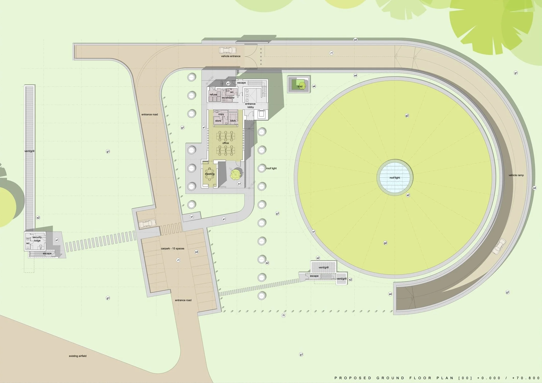 A masterplan evolved addressing issues of brief, context and policy. The key issue was sustainable regeneration and the re-use of a semi-derelict site within the Green Belt. The agreed strategy locates the development centrally within the site; as far away from the accessible site perimeter as practical and against a backdrop of the heavily planted boundary with the M56. The route to the accommodation is via existing hard-standing taxiways and the runway towards the north central edge of the site to a small car park beside which sits the building and adjacent, the ramp down providing vehicular access to the below-ground accommodation.