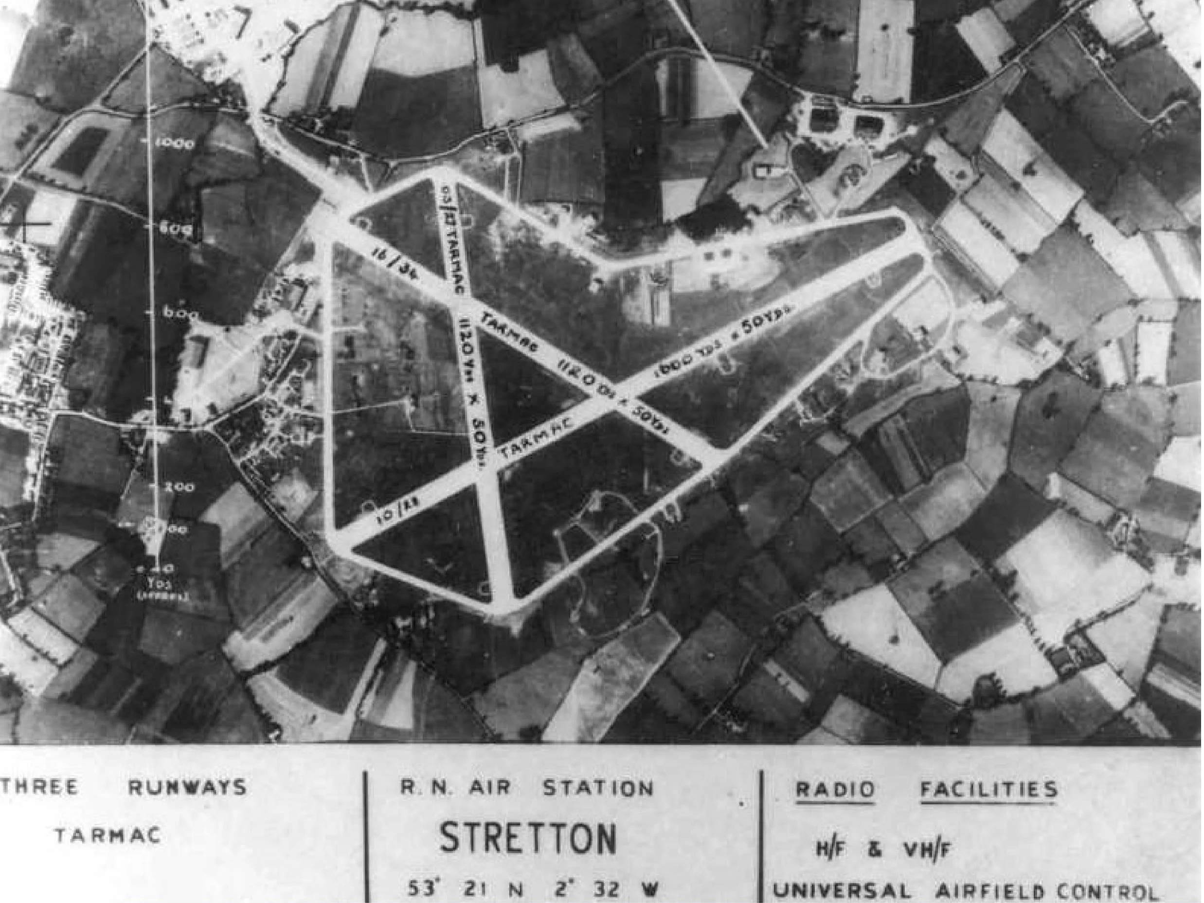 Royal Naval Air Station Stretton began life in 1942 as an RAF Night Fighter station and was known as HMS Blackcap. At this particular time in World War II both Manchester and Liverpool were suffering from “The Blitz” inflicted by the German Luftwaffe, and so initially 465 acres of agricultural land around the villages of Appleton and High Legh were set aside by the War Ministry for the construction of an airfield to protect both Manchester and Liverpool.